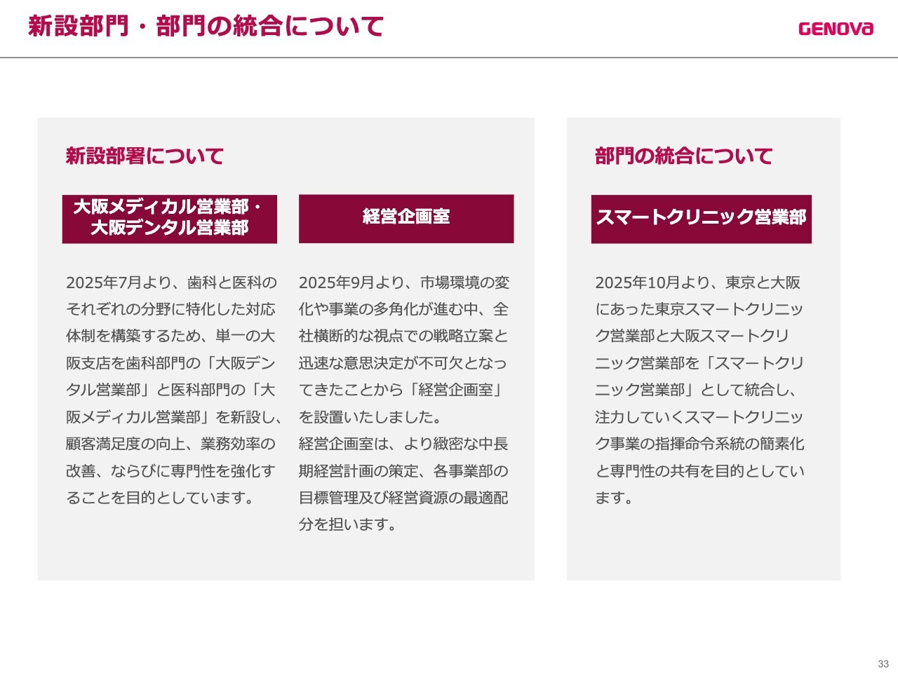 9月には、戦略立案と経営資源の最適配分を担う経営企画室を新たに設置しました。2025年10月には、東京と大阪のスマートクリニック営業部を「スマートクリニック営業部」と統合し、指揮命令系統の簡素化とノウハウの共有を図る予定です。
