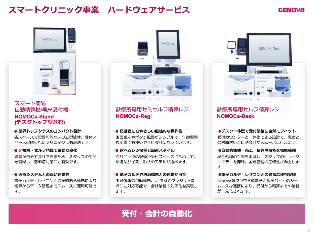 当社はクリニック向け自動受付精算機事業において最初にサービスを開始した企業です。その結果、自動受付精算機といえば「GENOVA」というブランドや認知度を築き上げており、この傾向は今後も続くだろうと考えています。