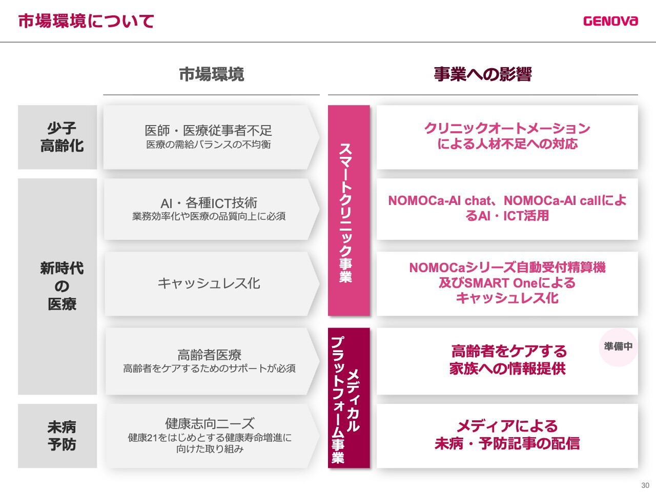 市場環境と事業への影響をまとめています。前回からこの表自体に変更はありませんが、一部では高齢者向けの情報提供を開始しており、事業は順調に進んでいる状況です。