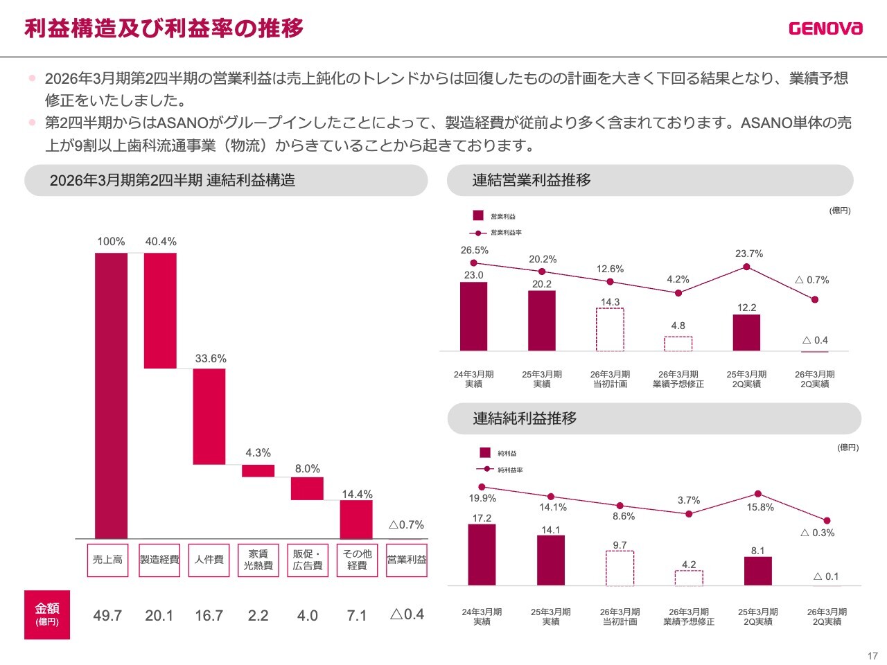 第2四半期からは、ASANO社がグループに加わったことにより、製造経費が従前より多く含まれています。ASANO単体の売上の9割以上が、歯科流通事業によるものです。