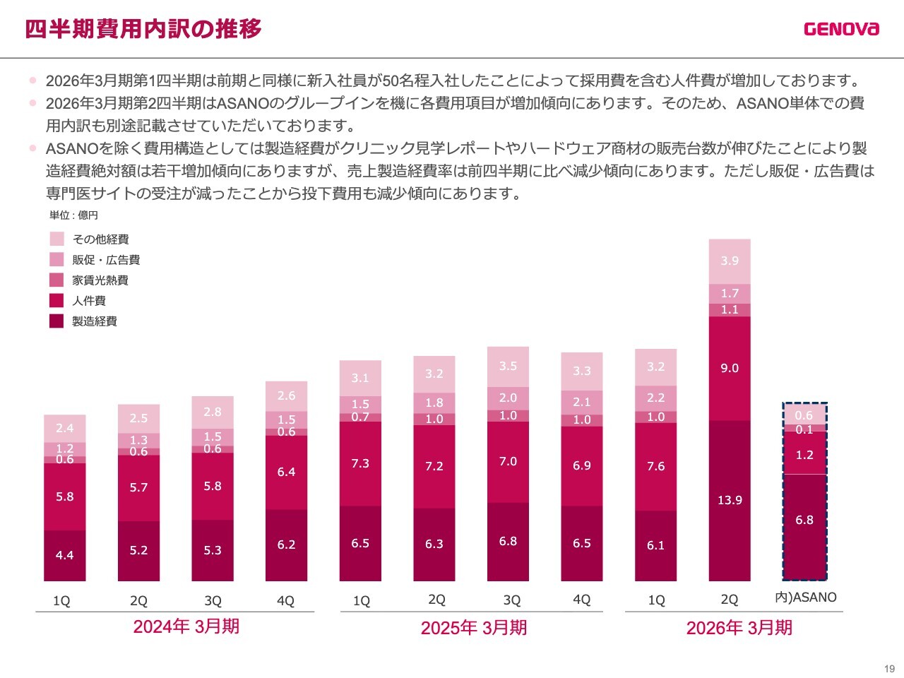 ASANO社を除く費用構造としては、クリニック見学レポートやハードウェア商材の販売台数の増加に伴い、製造経費の絶対額は若干増加傾向にあるものの、売上製造経費率は前四半期と比較して減少傾向にあります。
