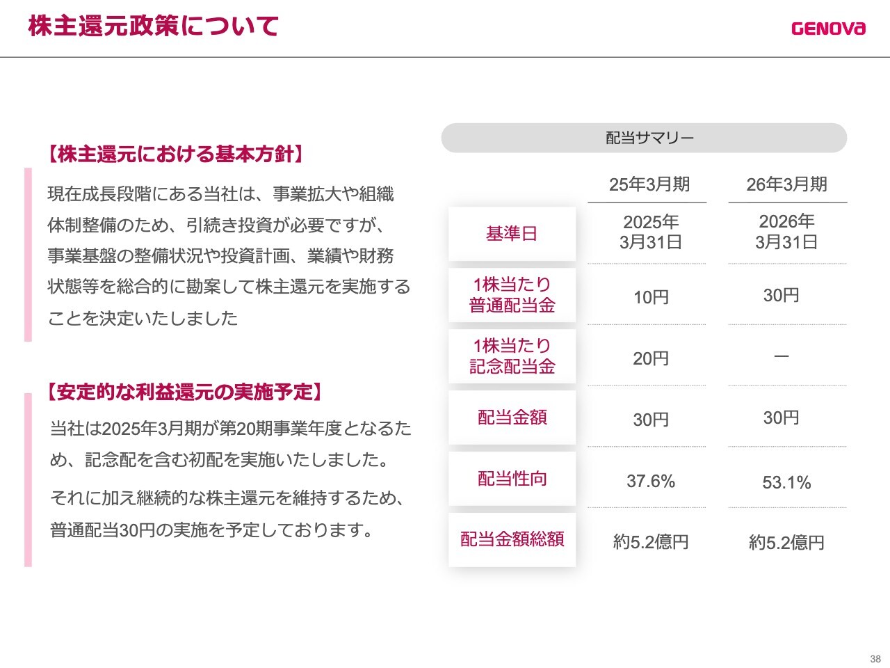 株主還元政策についてです。当社の創立20周年を記念し、初めての配当として普通配当10円に記念配当20円を加えた総額30円の配当を、2025年5月に実行しました。