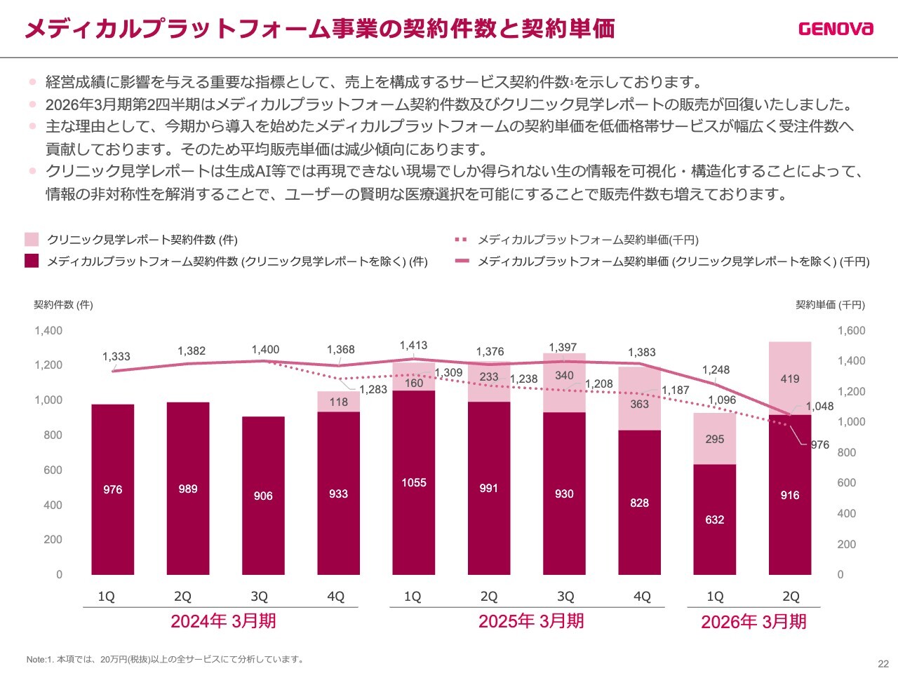 メディカルプラットフォーム事業の契約件数と契約単価についてです。2026年3月期第2四半期においては、メディカルプラットフォーム契約件数およびクリニック見学レポートの販売が回復しました。