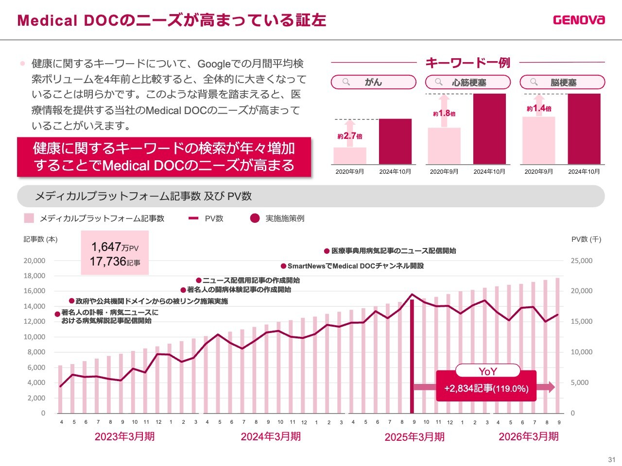 また、AIを活用した検索も非常に伸びており、ユーザーの健康に対する興味関心がAIを通じた検索にも表れている状況です。この領域をさらに強化することで、メディカルプラットフォーム事業のさらなる成長が期待できます。