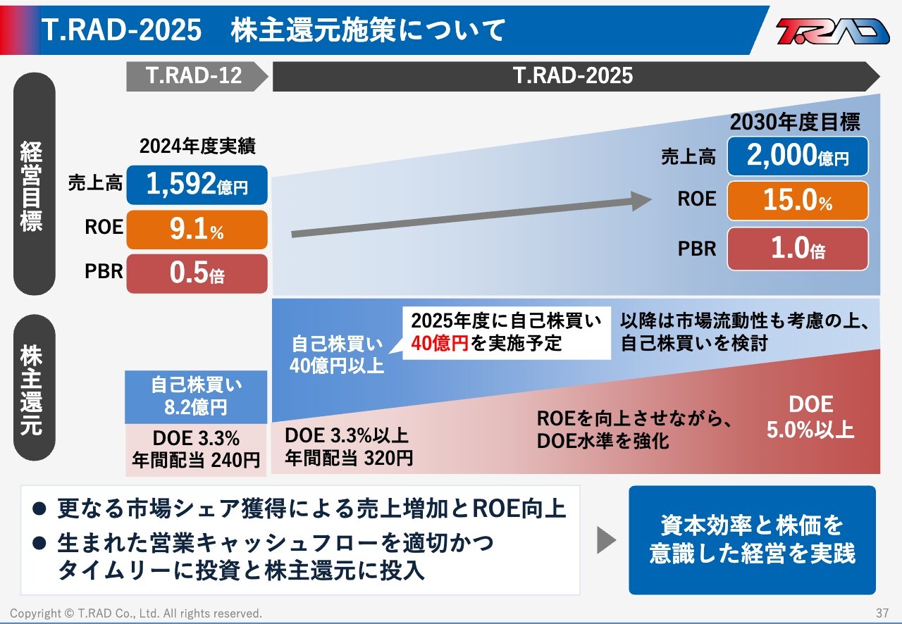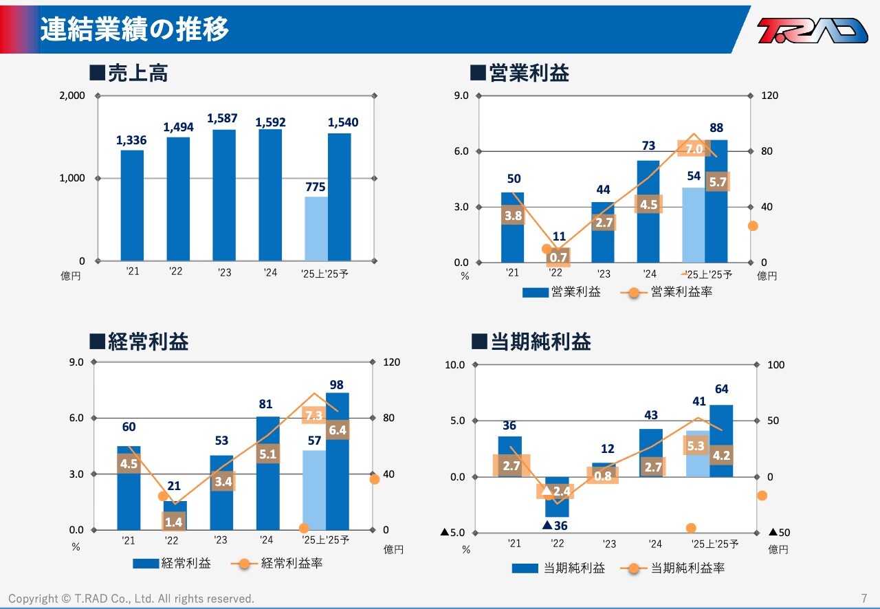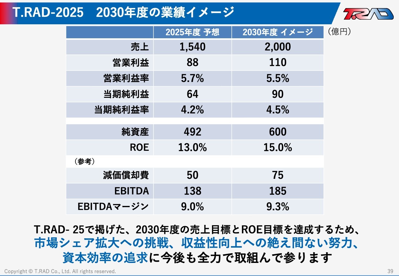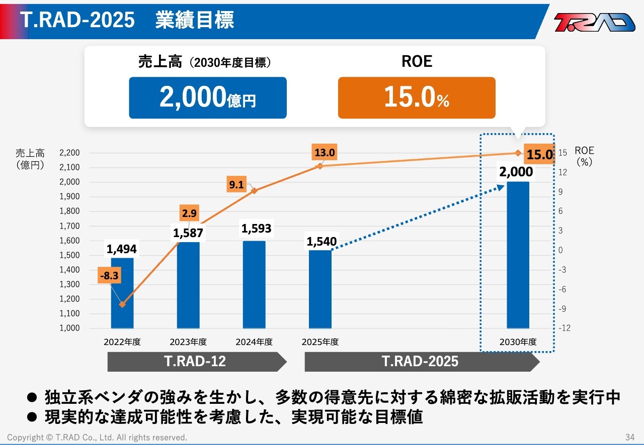 T.RAD-2025業績目標です。2030年に売上高2,000億円、ROE15パーセントを目指して取り組んでいます。今期については、売上1,540億円、ROE13パーセント程度を見込んでいます。