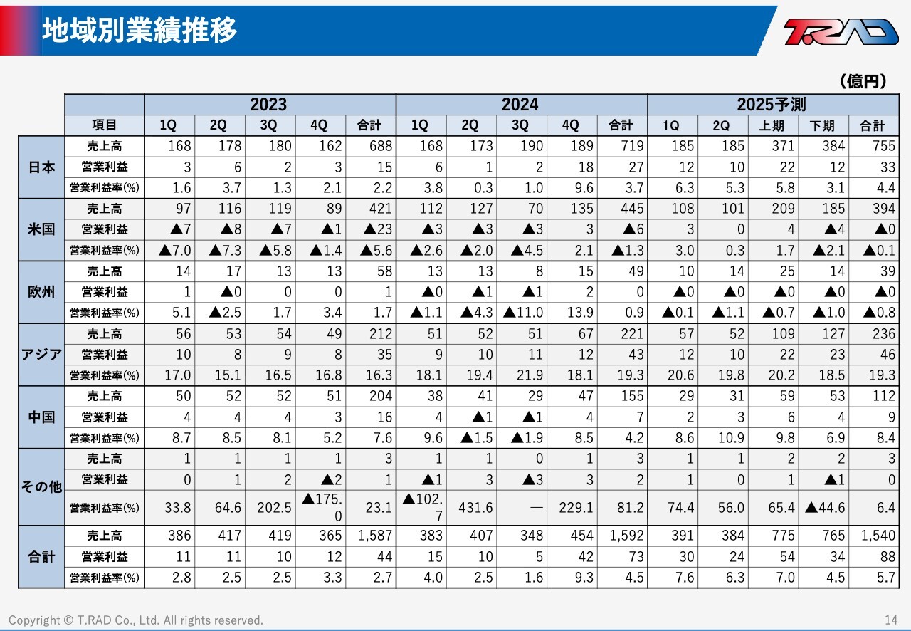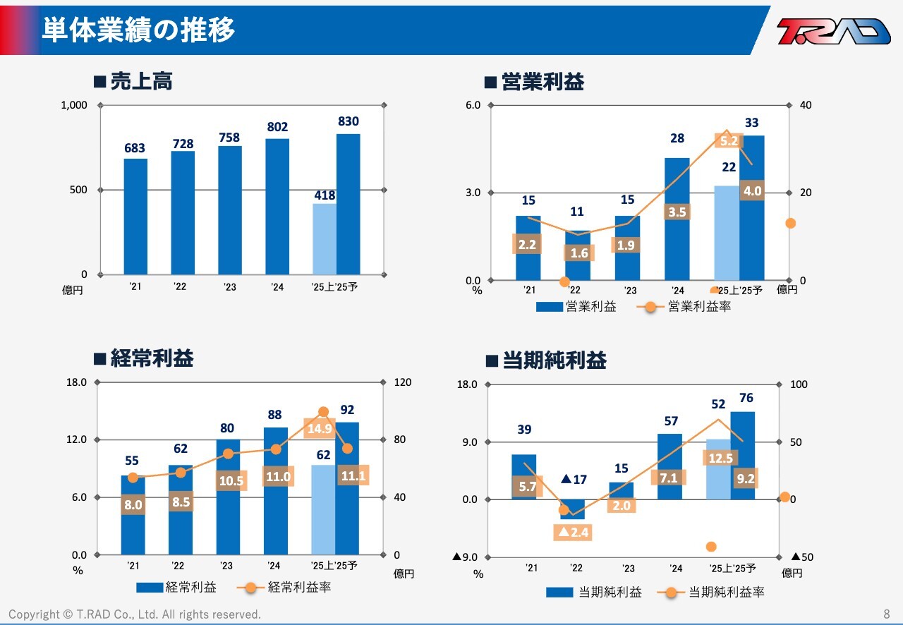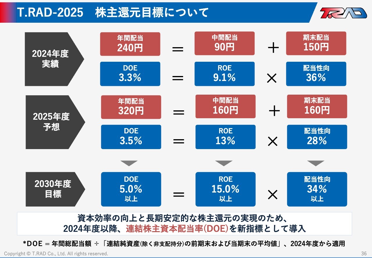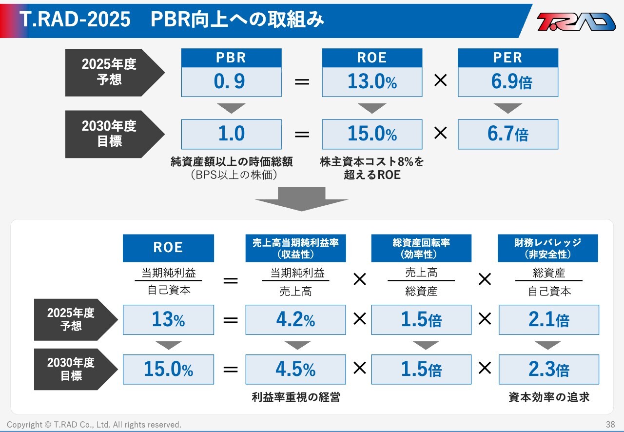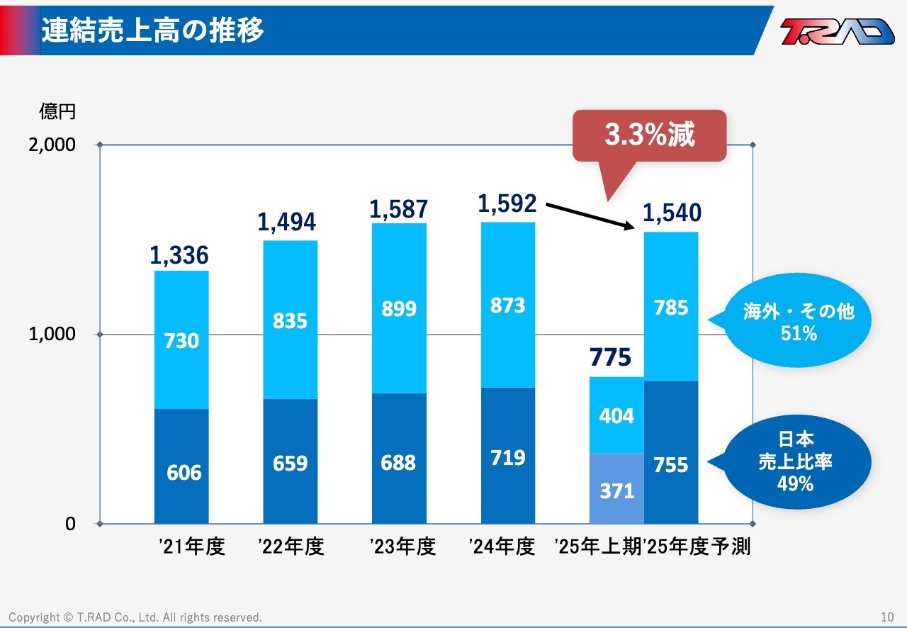 T.RAD-2025業績目標です。2030年に売上高2,000億円、ROE15パーセントを目指して取り組んでいます。今期については、売上1,540億円、ROE13パーセント程度を見込んでいます。