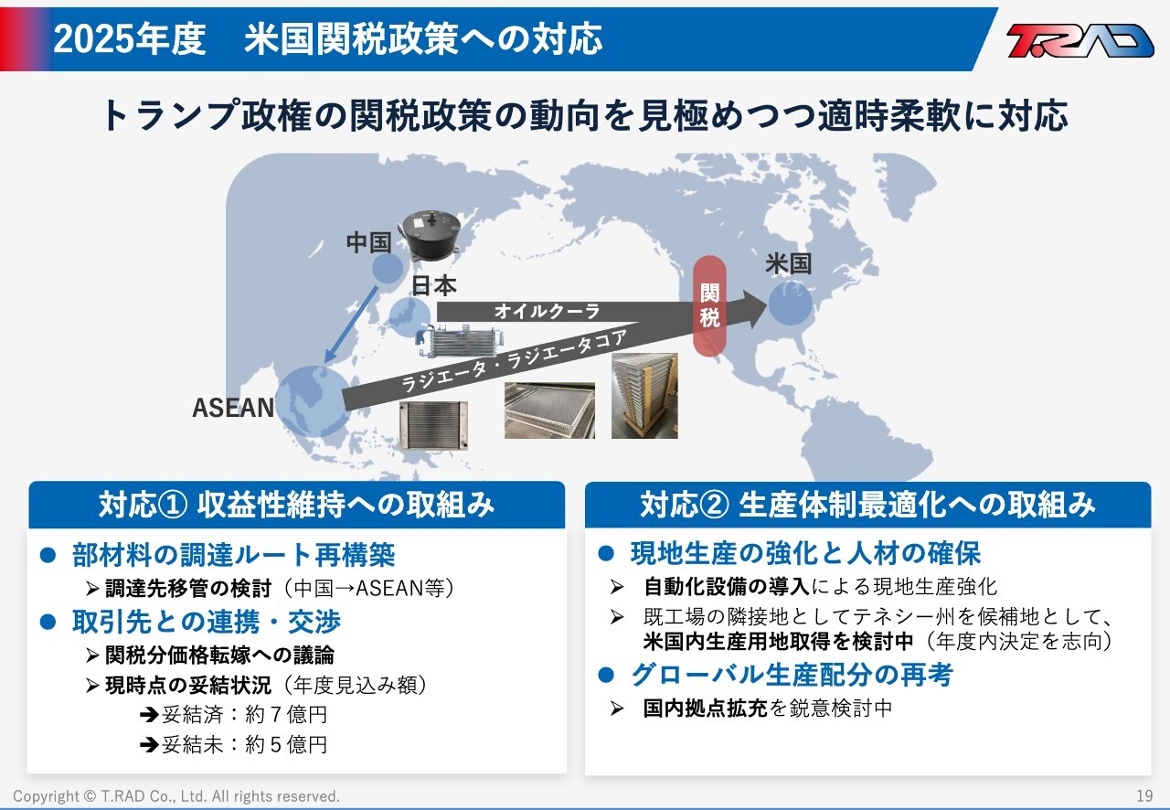 1つ目の収益性維持の取り組みとして、部材料の調達ルートの再構築を行っています。これまで中国で調達していた部品をASEANでも調達できないかと検討しています。また、得意先への連携・交渉として、関税分の価格転嫁について議論を行っています。今年度の関税負担額見込みは12億円ですが、それに対する交渉の妥結状況はご覧のとおりです。