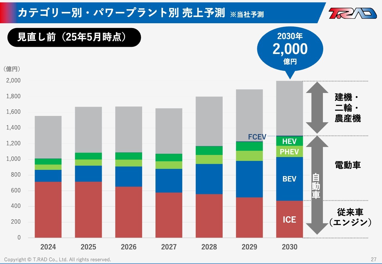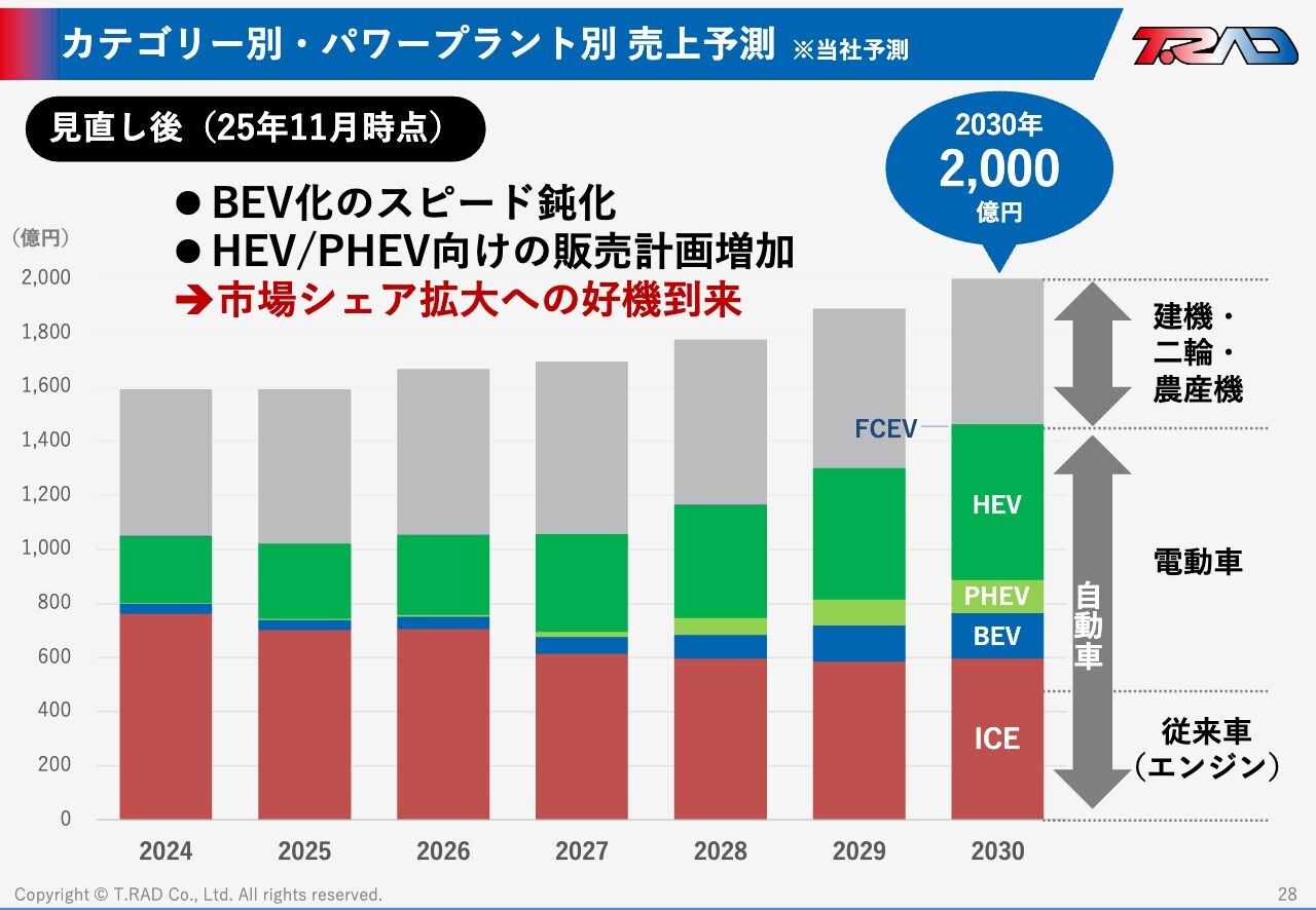 2030年に売上高2,000億円を目指すにあたり、2025年5月にパワープラント別の売上予測を開示しました。開示当時から、トランプ政権の関税政策やバッテリーEV優遇政策の見直し、それに伴うお客さま側での戦略変更やバッテリーEV導入の後ろ倒しなどを経て、売上予測の見直しを行いました。