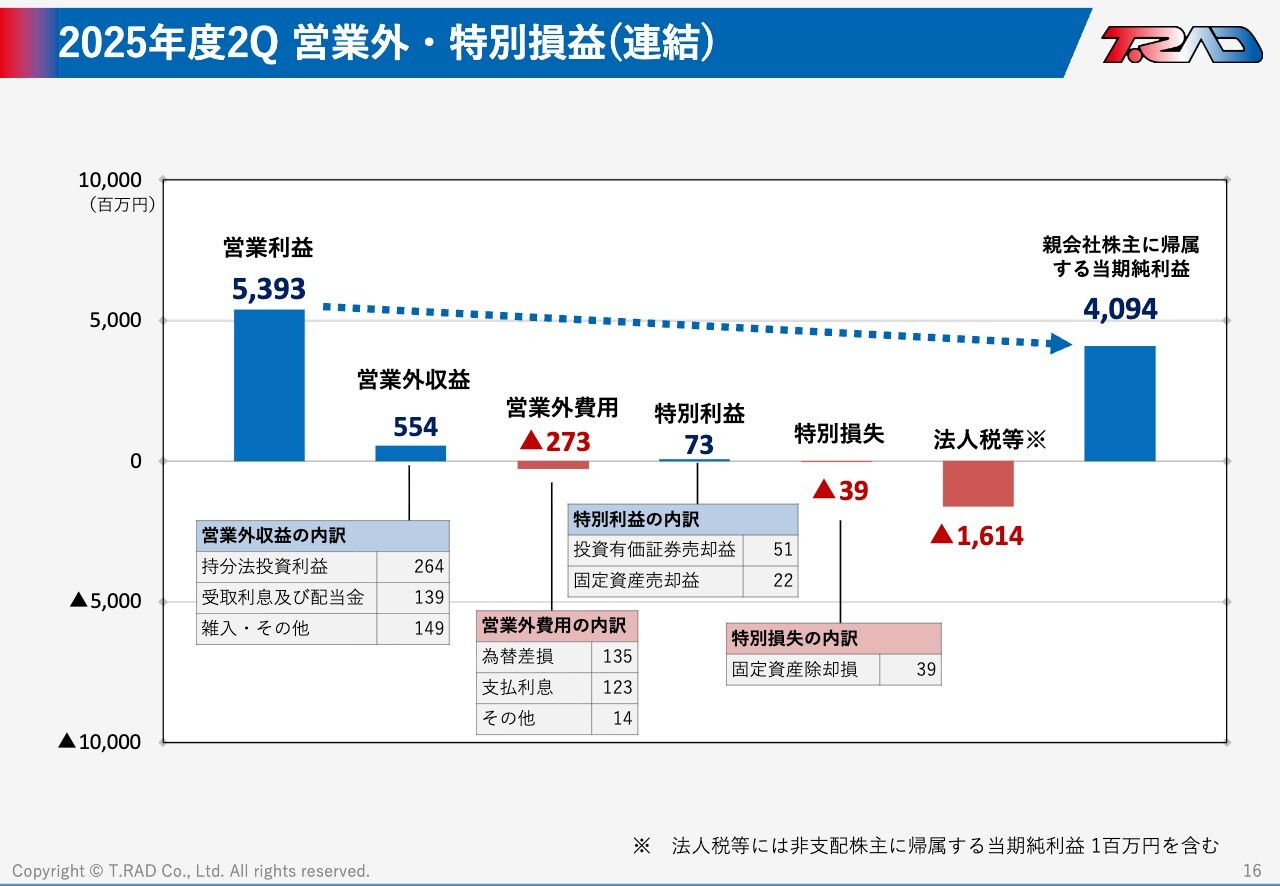 スライドには、2025年度第2四半期における営業外損益、特別損益の状況を示しています。営業利益53億9,300万円から、当期純利益40億9,400万円へ変動した要素となります。特別損失、固定資産の除却損は3,900万円とミニマルな水準となっています。