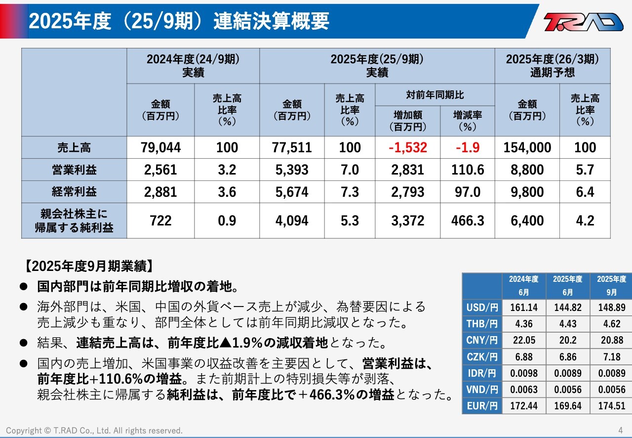 木下薫氏(以下、木下):株式会社ティラド経理・財務管掌の木下です。本日は、ご多忙のところ弊社決算説明会にご参加いただきありがとうございます。2025年度第2四半期の業績についてご説明します。