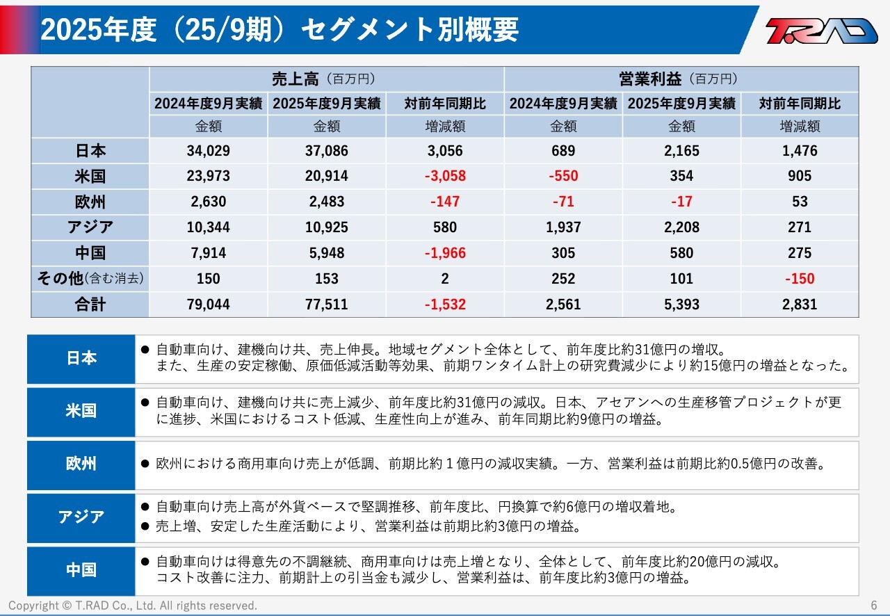 地域セグメント別の決算概要をご報告します。スライドの表の左側の売上高の、対前年同期比の増減額をご覧ください。米国、欧州、中国が減収となっています。同地域では、自動車向け、商用車向けの外貨ベースでの売上が減少しています。景気低迷による販売減少や円高が主な要因となります。