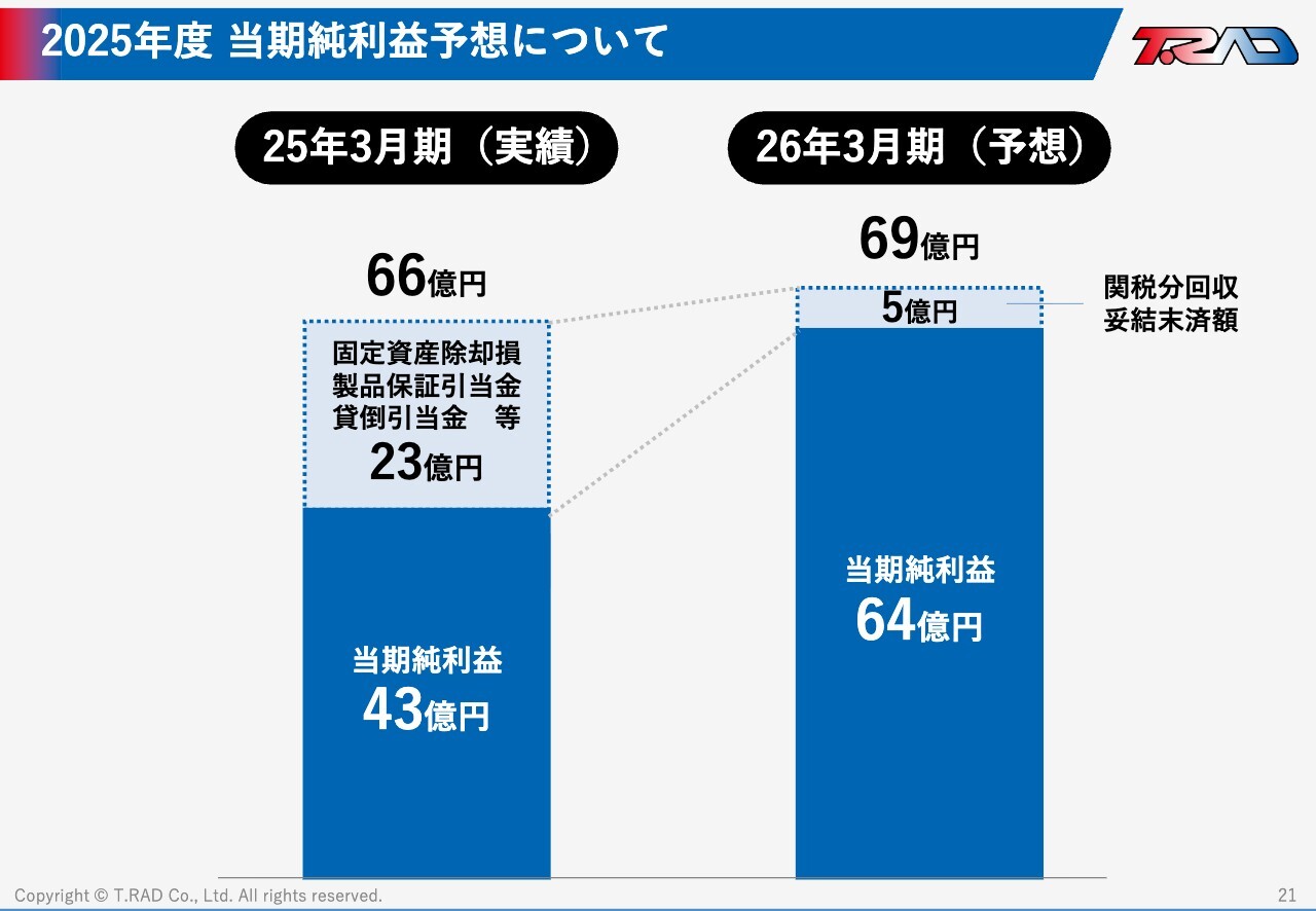 今期は今のところ、そのような一時的な要素はなく、関税の未回収分の合計のみを見込んだ64億円となっています。一時的な要因がなかったとすると、昨年度は66億円、今年は69億円と、当期純利益のベースが上がっています。