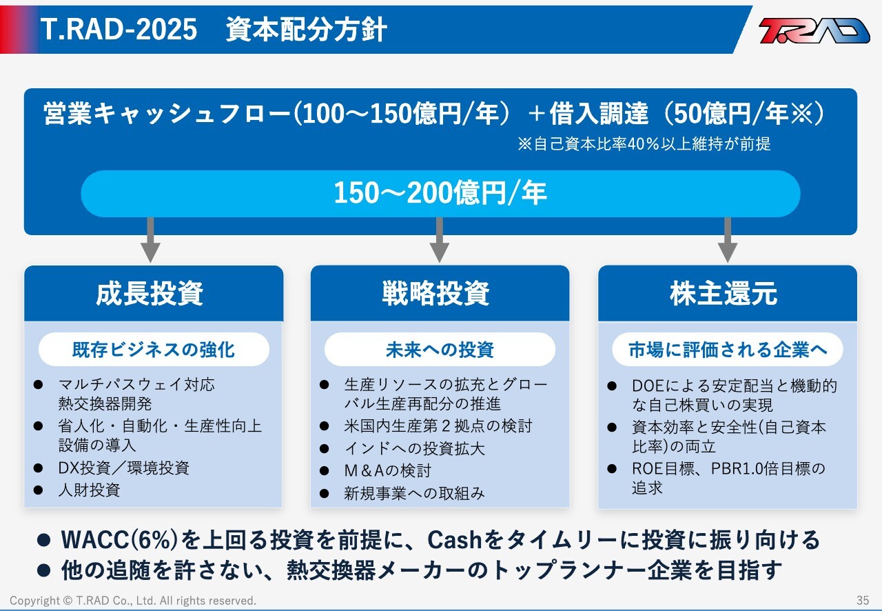 WACC(6パーセント)を上回る投資を前提として、キャッシュをタイムリーに投資に振り向けていき、熱交換器専門メーカーとしてトップを目指していきたいと考えています。