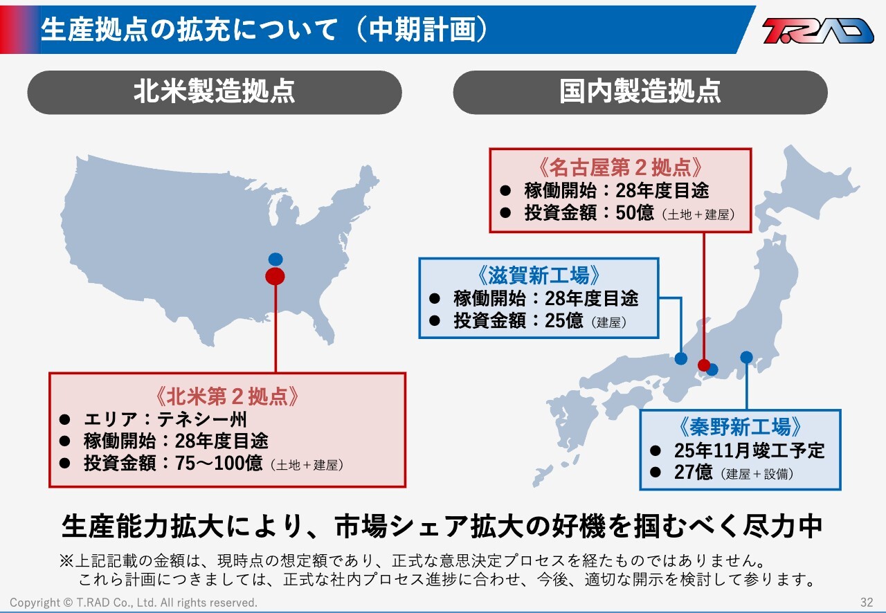 先ほど、北米で非常に大きなお客さまのニーズがあることをお伝えしました。このニーズに応えるため、北米の生産拠点を、現在のケンタッキー州拠点の近くとしてテネシー州内に工場を新設する計画を検討しています。投資金額としては75億円から100億円程度を見込んでいます。