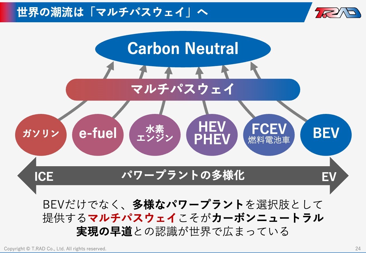 これはマルチパスウェイと言われており、このBEVに頼らずさまざまなパワープラント(ガソリンエンジン、e-fuel、水素エンジン、ハイブリッド、燃料電池、BEV)をその地域の特性に合わせて導入していくことがカーボンニュートラル実現の早道だという認識が、世界で広まっています。