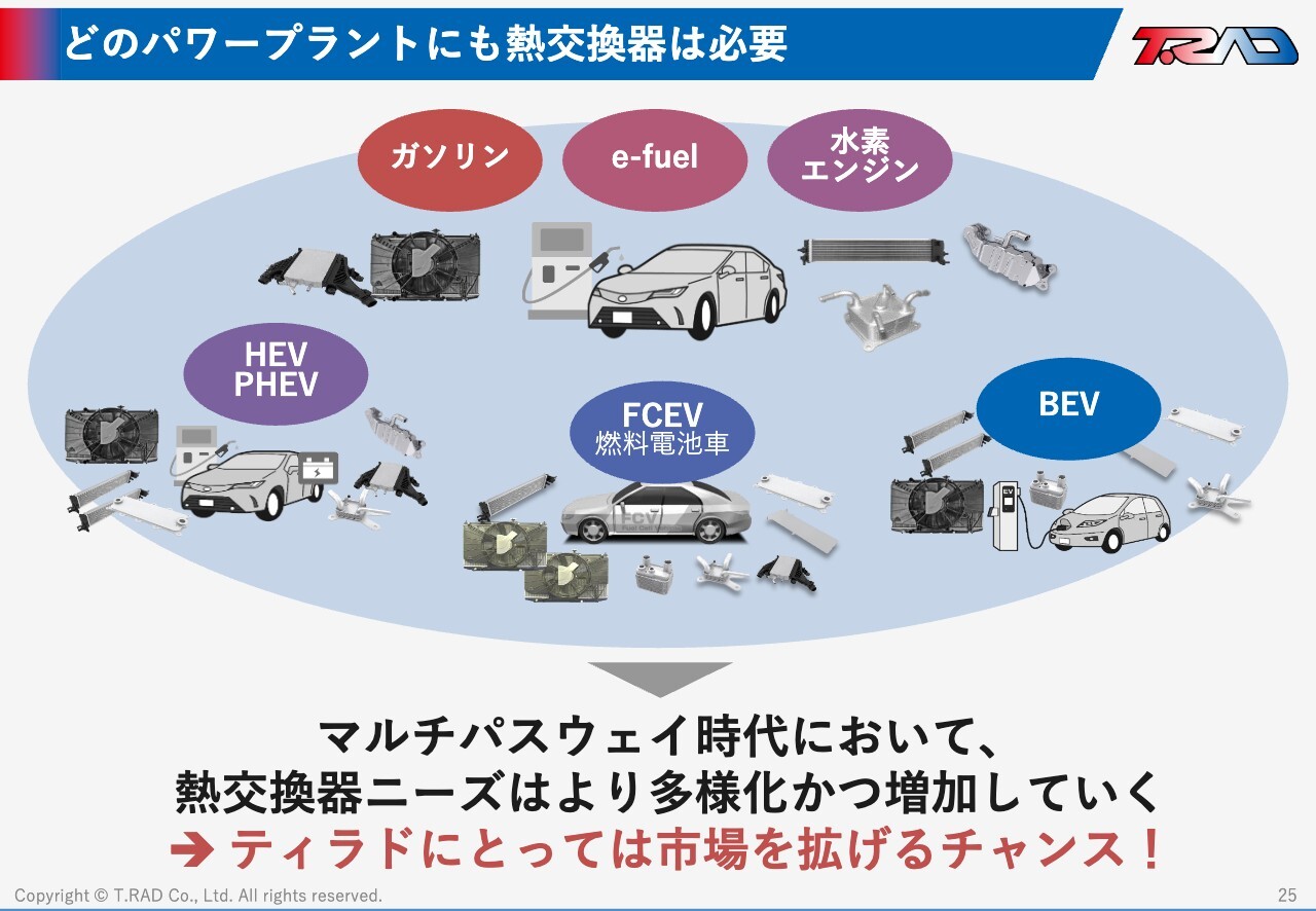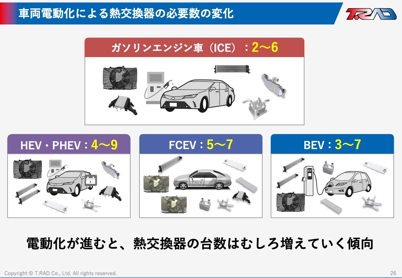 「電動化が進むと熱交換器はあまり搭載されないのではないか?」というご意見もありますが、モーターやバッテリー、インバータ等を冷やすための熱交換器が必要になり、それらをさらに冷却する低温のラジエータも必要になります。そのため、熱交換器の搭載台数は電動化が進むにつれ増えていく傾向にあります。