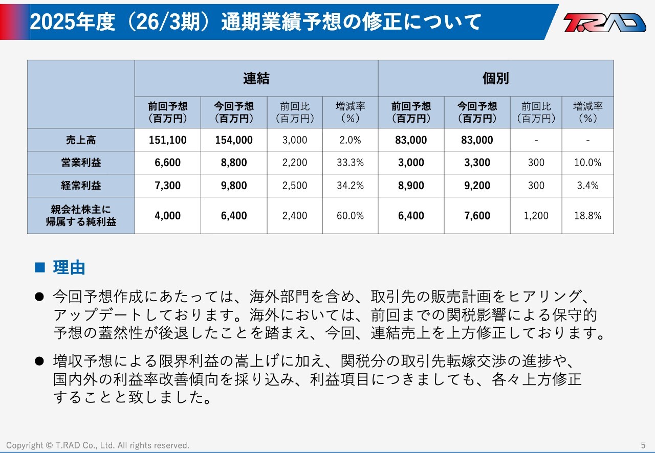 中間期決算が好調に着地したことと、米国関税影響に対してもダウンサイドリスクが和らいだこともあり、スライドに示したとおり、2025年度通期の業績予想を上方修正しています。