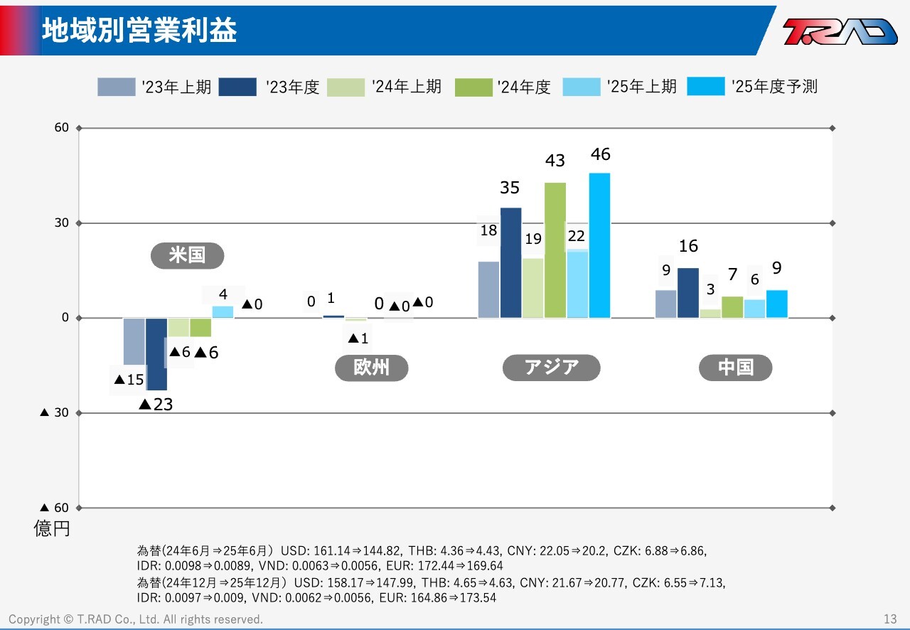 地域別の営業利益推移です。米国セグメントの収益性改善、アジア地域の利益拡大が確認できると思います。また、中国においては、減収傾向が続く中、固定費の削減等、利益率維持への取組みと効果がグラフに現れています。今後も中国においては、全体として黒字を維持できるよう取り組んでいきます。