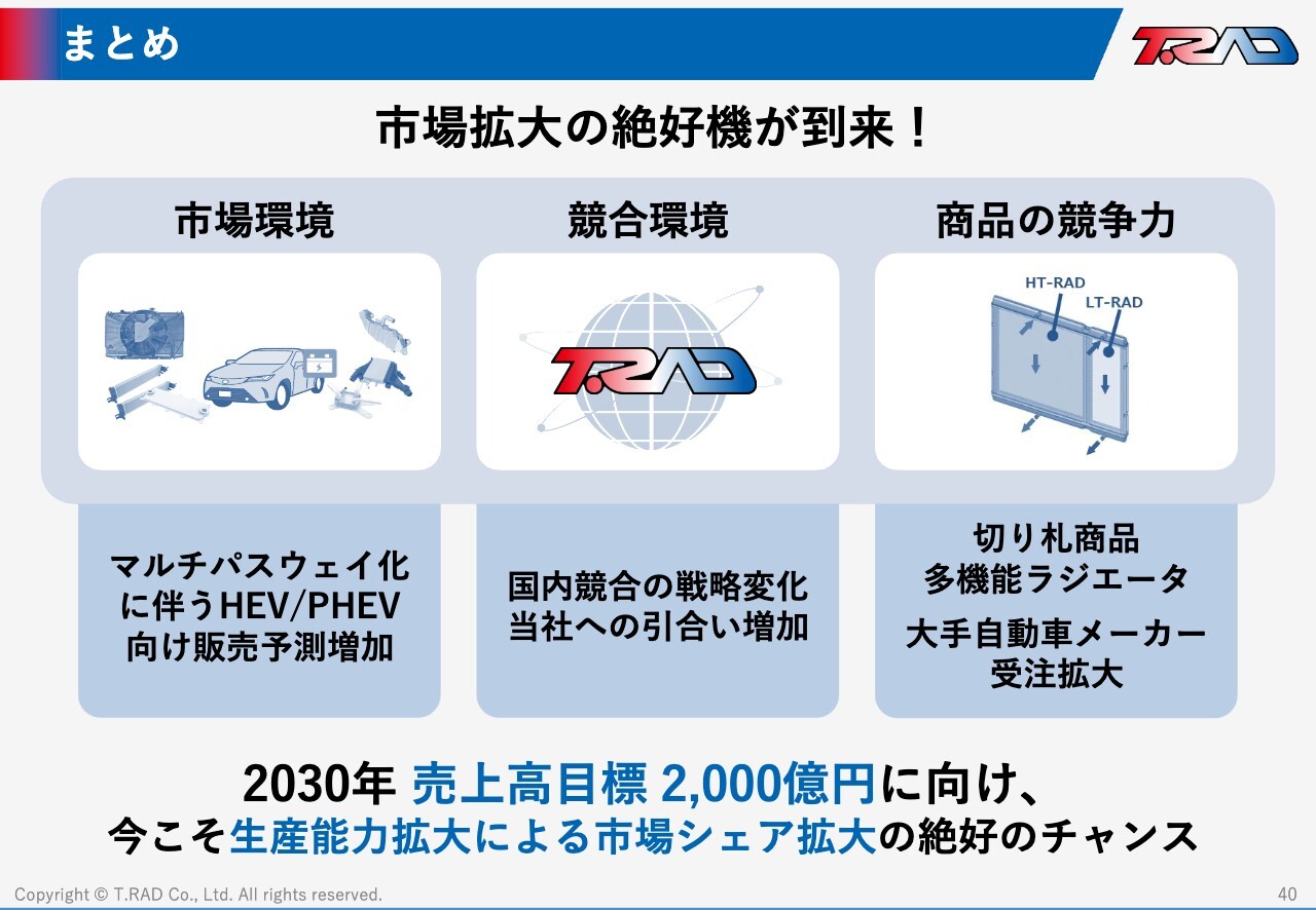 現在、当社は市場拡大への絶好のチャンスだと考えています。このマルチパスウェイ化に伴うハイブリッド、プラグインハイブリッド向けの販売予測が増加していること、国内の競合他社の戦略変化等により当社への引き合いが増加していること、そして、このハイブリッド向けの競争力のある製品が大手自動車メーカーに採用されたことで受注拡大している状況であるためです。