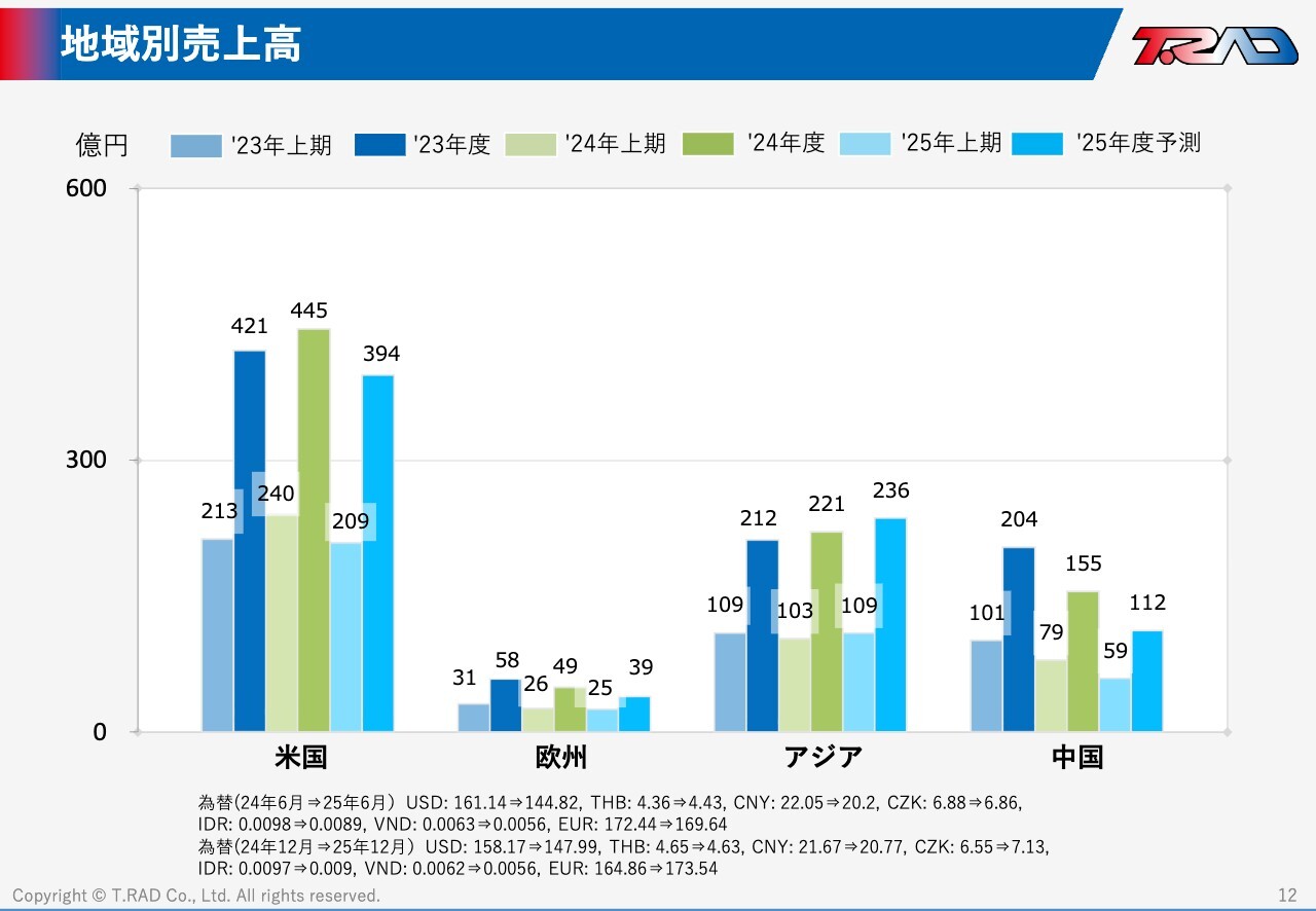 一方で、米国は売上が下期に落ちると予測しており、その分利益も落ちるということです。米国については、新規の受注が決まる一方で、欧米系のATVと呼ばれる全地形型車両向けの売上が落ちている要素を見込んだものとなっています。