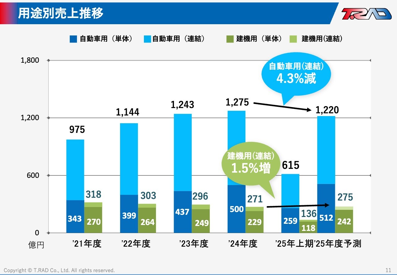 用途別の売上推移です。青色で示している自動車向けの売上ですが、米国、中国の状況を反映し、2025年度は全体として減少する予想としています。緑色で示している建産機用売上は、2025年度は前年度比で1.5パーセント増加する見通しとなっています。過去の生産調整の反動としており、トレンドの改善とは見ていません。