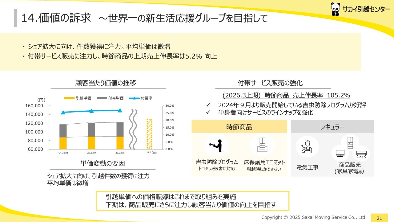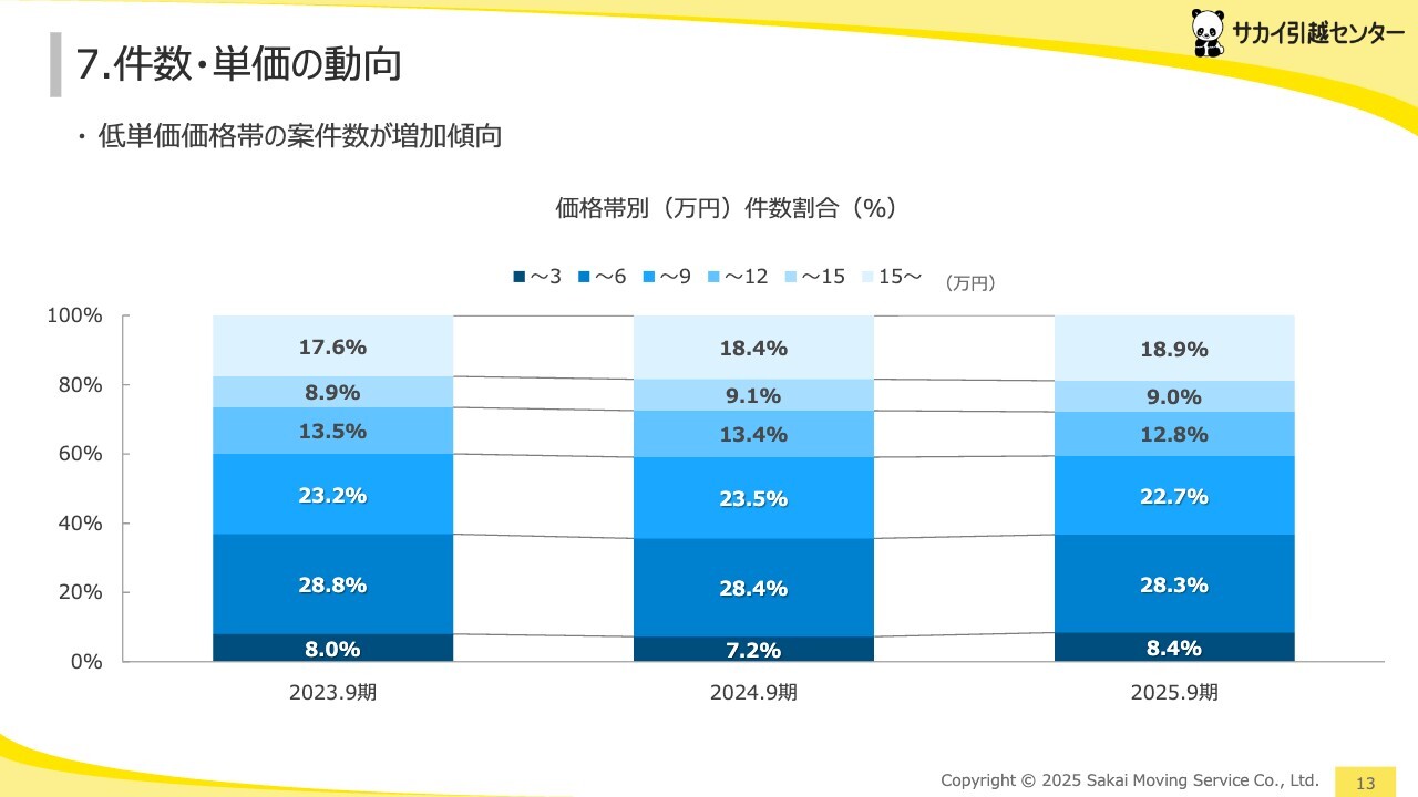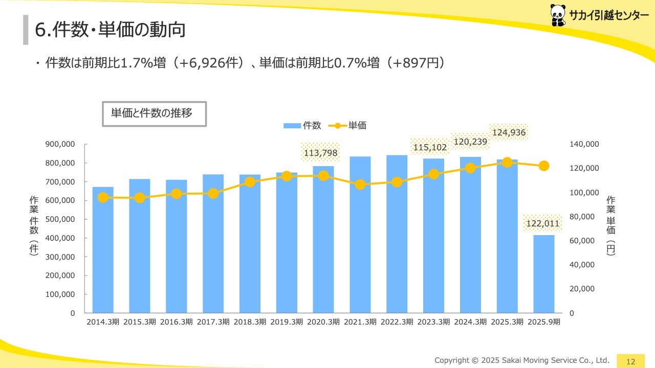 ご覧のとおり、平均単価は微増しました。引越件数の獲得に注力し、特に単身者の引越が増加したため、全体としてミックス効果により単価は上げ止まった状況です。