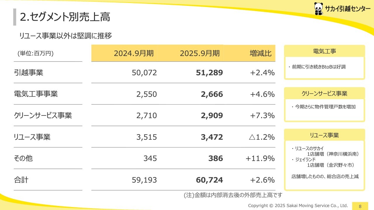 セグメント別売上高です。引越事業は前期比2.4パーセント増の512億8,900万円、電気工事事業は前期比4.6パーセント増の26億6,600万円、クリーンサービス事業は前期比7.3パーセント増の29億900万円、リユース事業は前期比1.2パーセント減の34億7,200万円、その他の事業は前期比11.9パーセント増の3億8,600万円となっています。