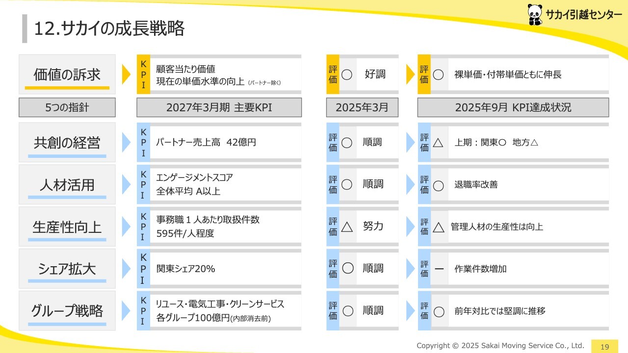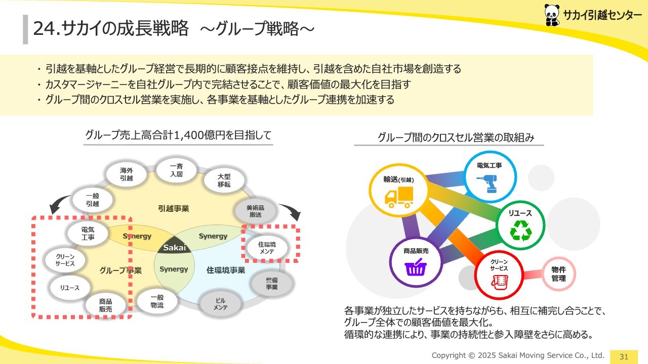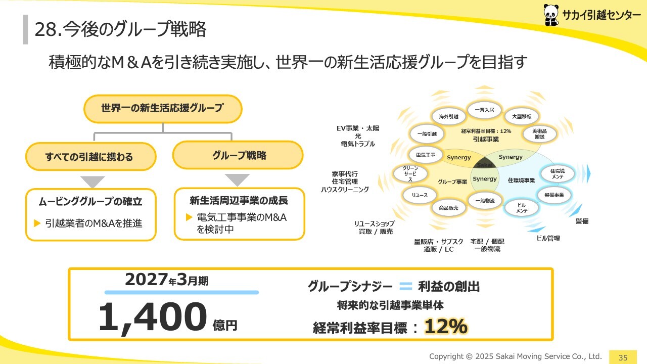 グループ戦略としては、2027年3月期にグループ全体での売上高1,400億円、将来的には経常利益の目標を12パーセントで維持したいと考えています。このような数値目標を掲げ、引越事業単体として今後も取り組んでいきます。