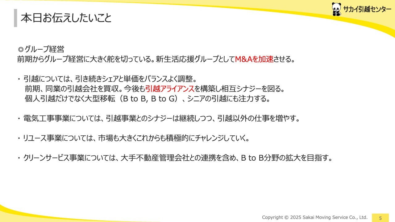 スライドのとおり、今後も引越でシナジーが生まれる事業として、海外引越や一般物流などに注力していくためのM&Aを積極的に進めていきたいと思っています。