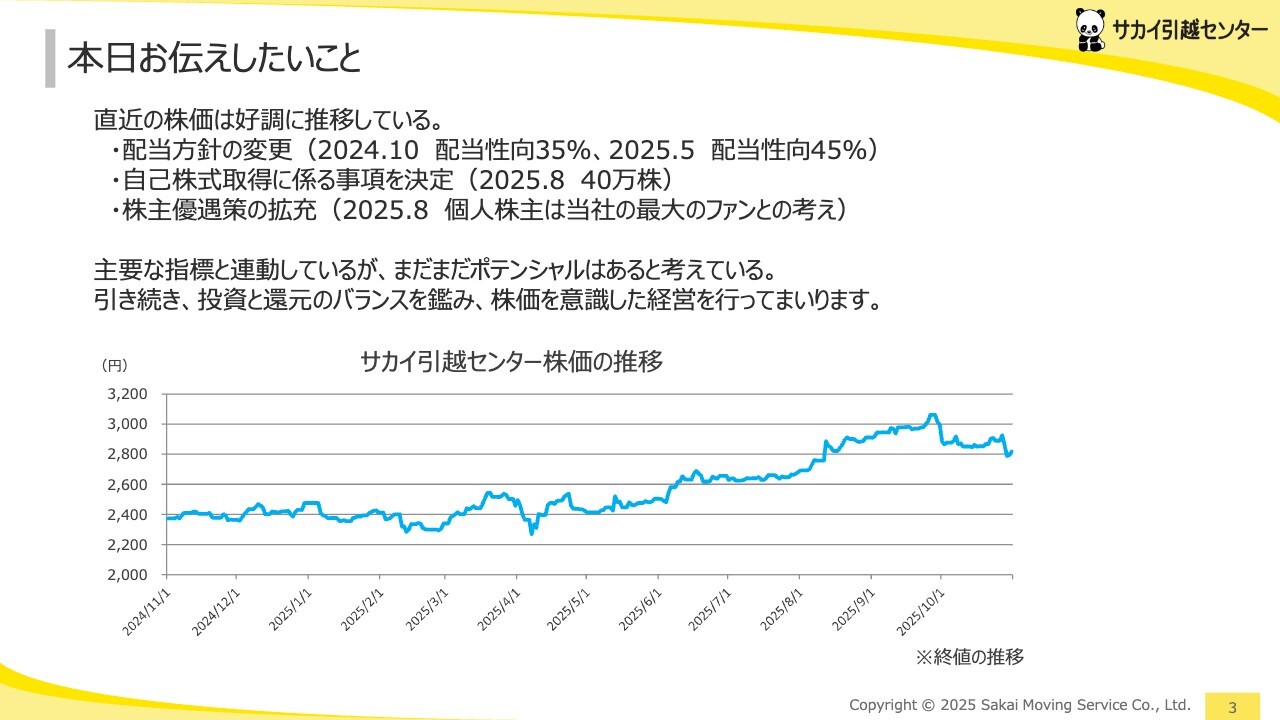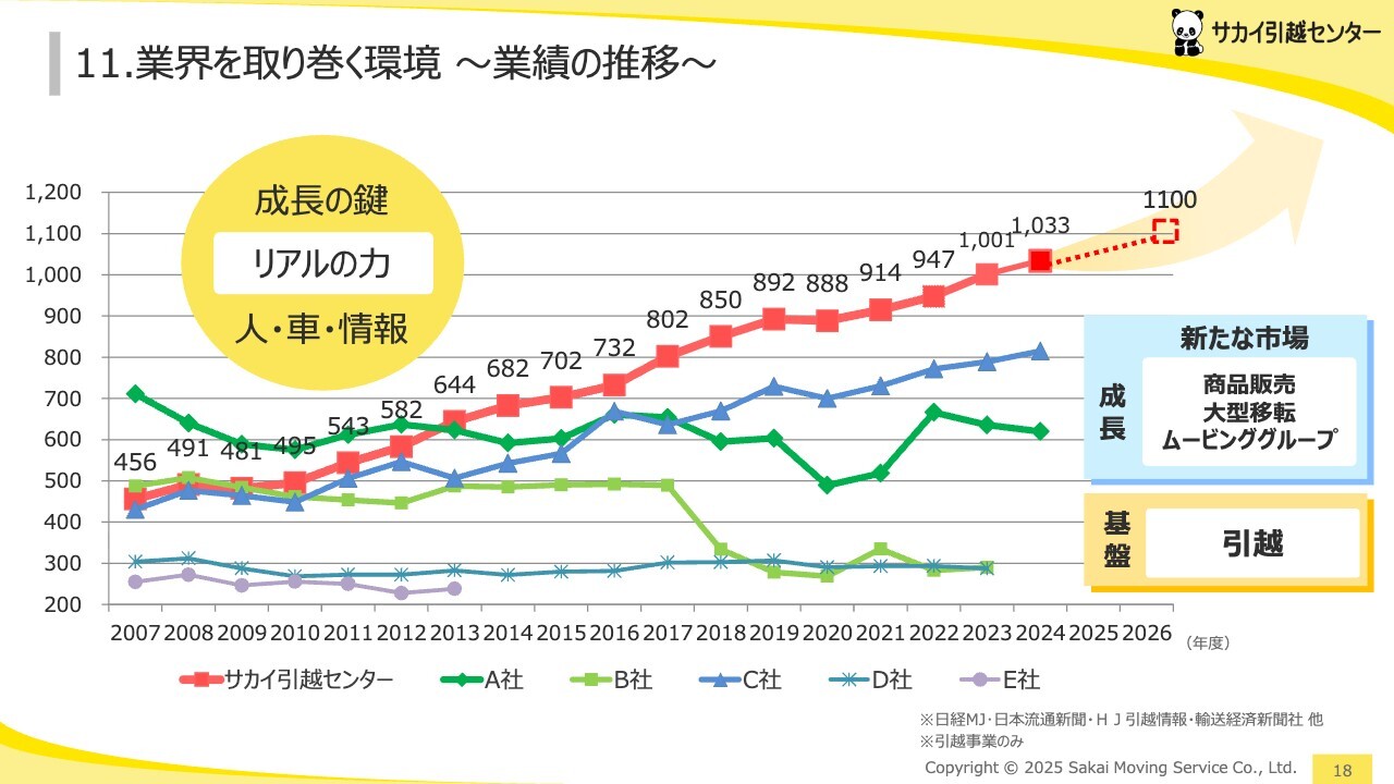 山野幹夫氏(以下、山野):株式会社サカイ引越センター専務取締役の山野です。本日は私から全体的な説明を行い、上席執行役員の立川より成長戦略について、経理については経理本部の下田からご説明します。よろしくお願いします。