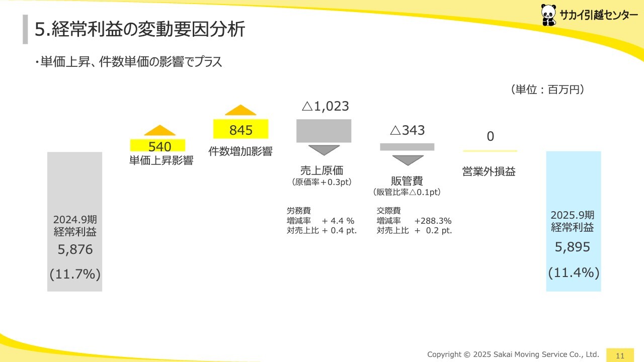 個別の経常利益の変動要因についてご説明します。増益要因としては、単価上昇により5億4,000万円、件数増加により8億4,500万円の増加が挙げられます。減益要因としては、売上原価で労務費の増加などにより10億2,300万円、販管費では交際費の増加とありますが、こちらには株主優待のお米の発送などが含まれており、その増加が主な要因で3億4,300万円の減少となっています。