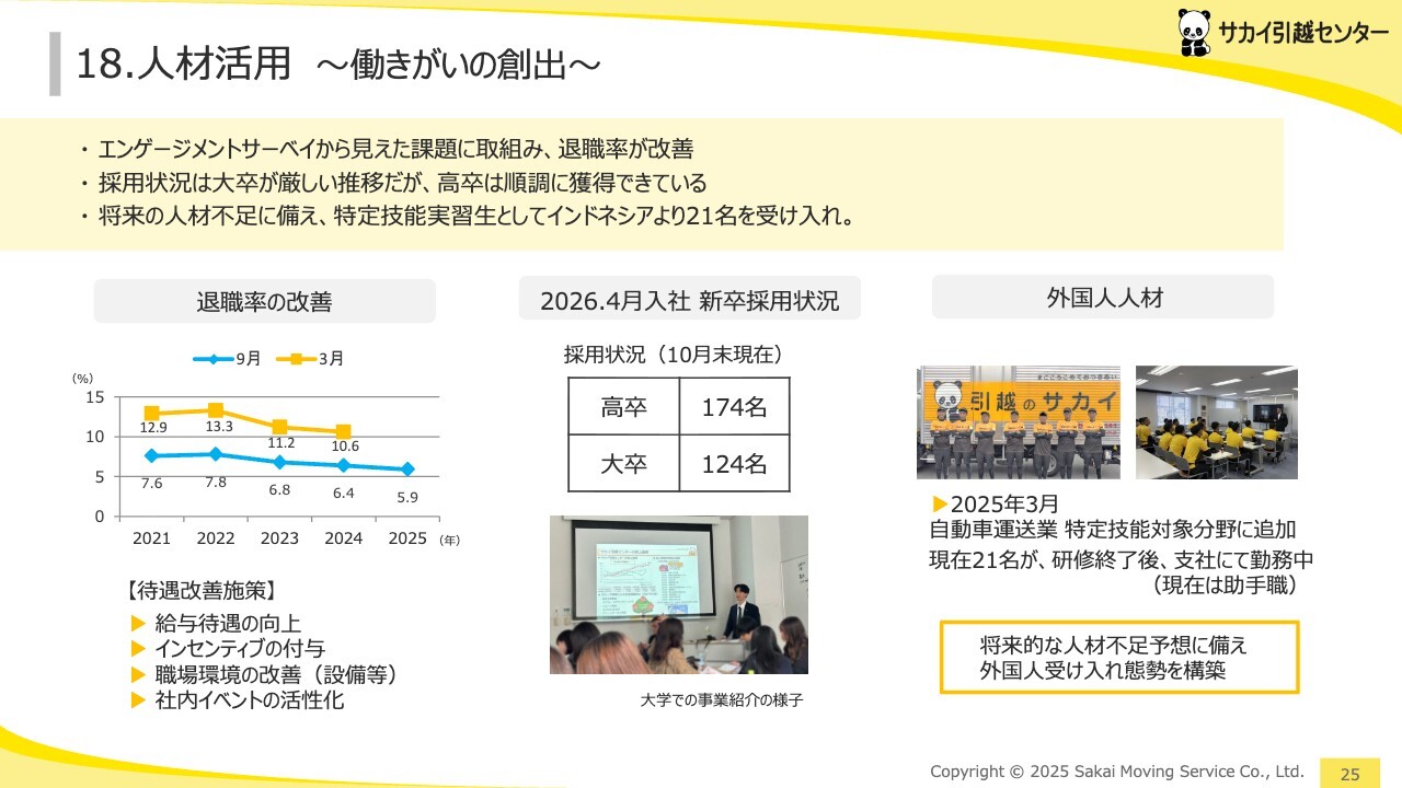 外国人材の取り組みについては、インドネシアから特定技能外国人として21名のドライバーが誕生しました。今期の3月までには30名のドライバーが誕生する予定です。さらに来期に向けては、20名を引越作業の助手スタッフとして雇用する計画です。