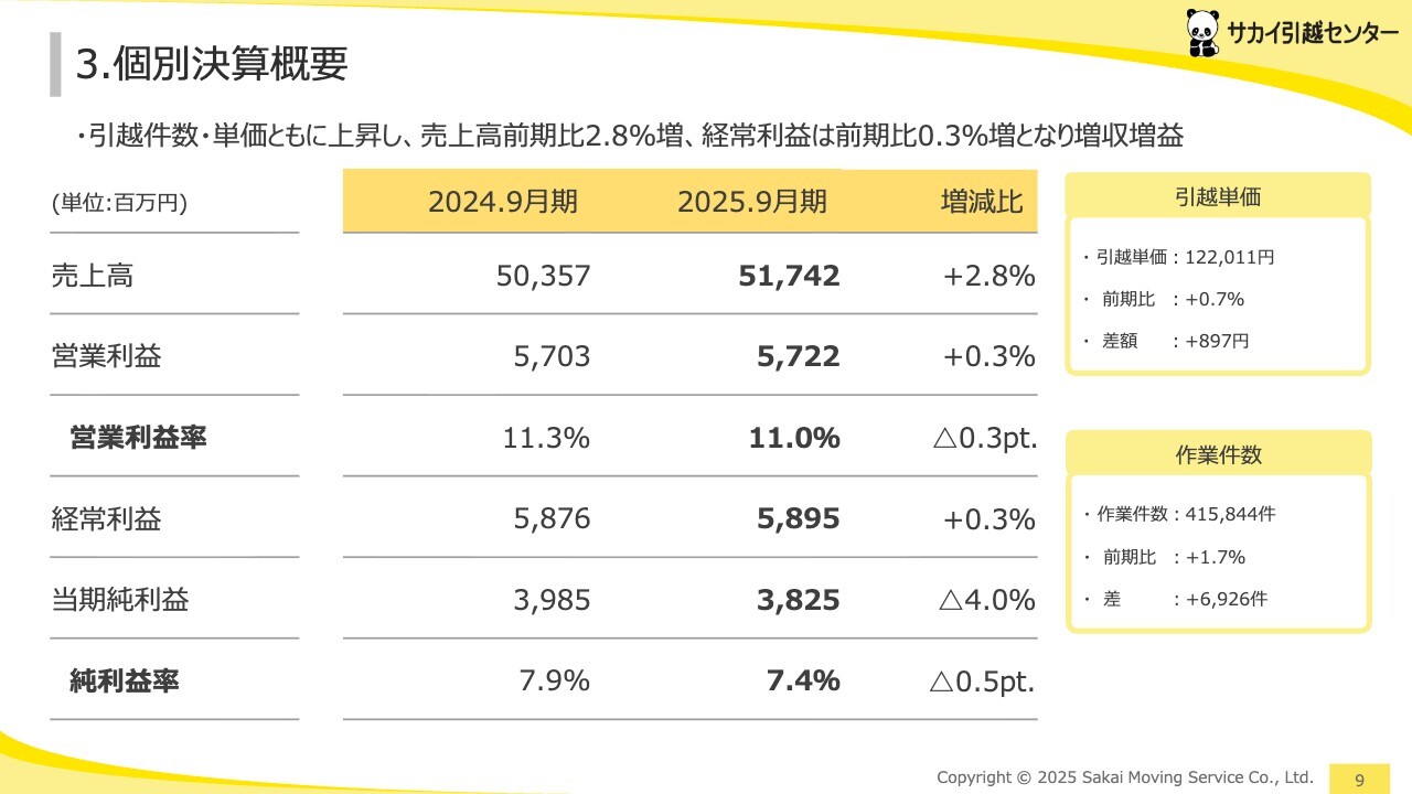 個別決算の概要です。2025年9月期の売上高は前期比2.8パーセント増の517億4,200万円、営業利益は0.3パーセント増の57億2,200万円、経常利益は0.3パーセント増の58億9,500万円、当期純利益は4.0パーセント減の38億2,500万円となりました。