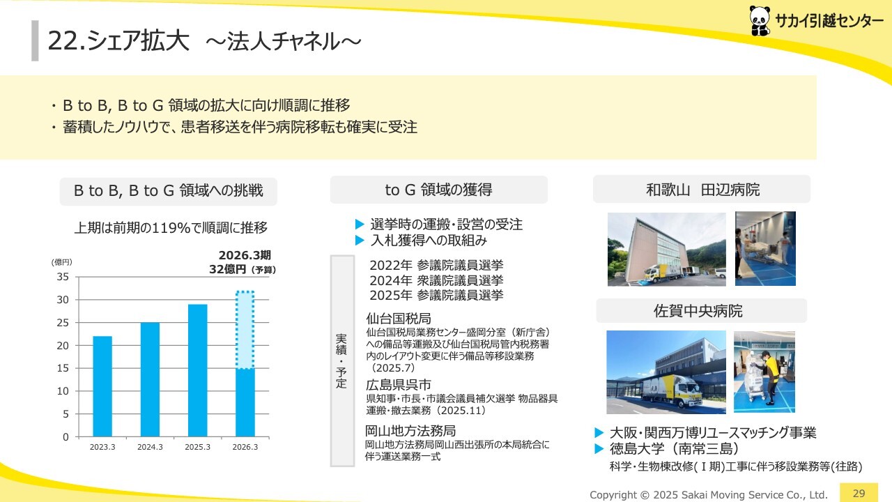 シェア拡大についてです。現在強化しているのは、BtoBおよびBtoG領域への挑戦です。スライド左側のグラフにあるように、今期の予算は32億円で、市場としてはBtoBおよびBtoGの大型移転が対象となっています。