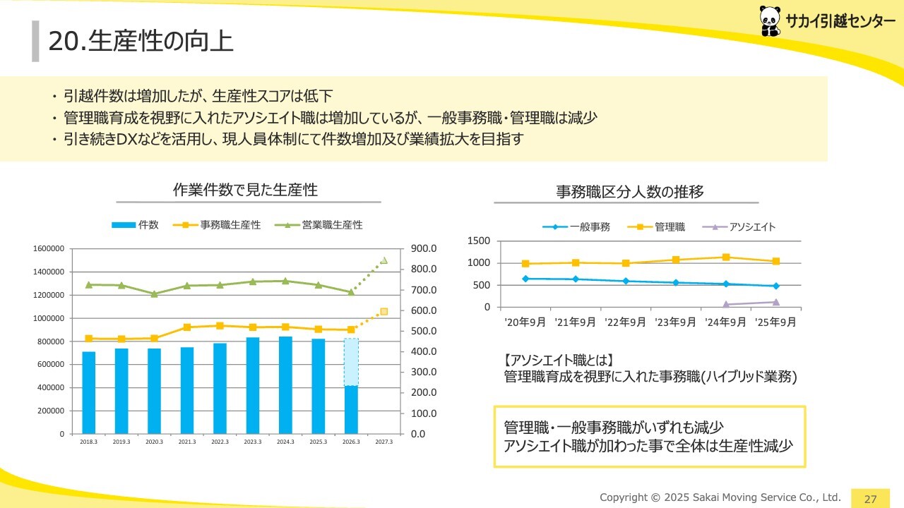 生産性の向上についてです。スライド右側のグラフをご覧ください。一般事務、管理職、アソシエイトおよび内勤職の人数の推移を表したグラフです。一般事務と管理職の人員については抑制しています。