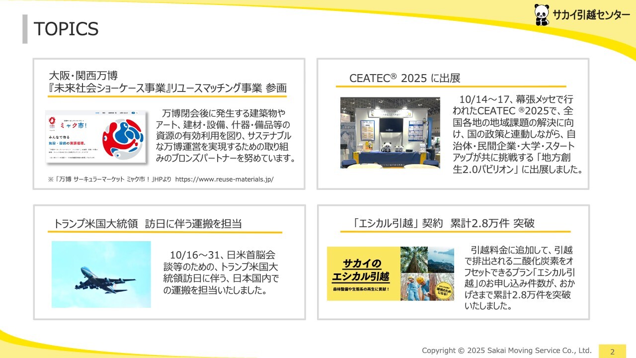 はじめにトピックスについてご説明します。関西の会社として、万博が無事に終了し大変うれしく思っています。当社にとっては、万博が終わってからが本格的な仕事のスタートです。荷役に関連するボランティア活動や、それ以外にもリユースのマッチング事業を展開しており、万博で発生したレガシーを販売する活動に取り組んでおり、その保管と運搬にも携わっています。