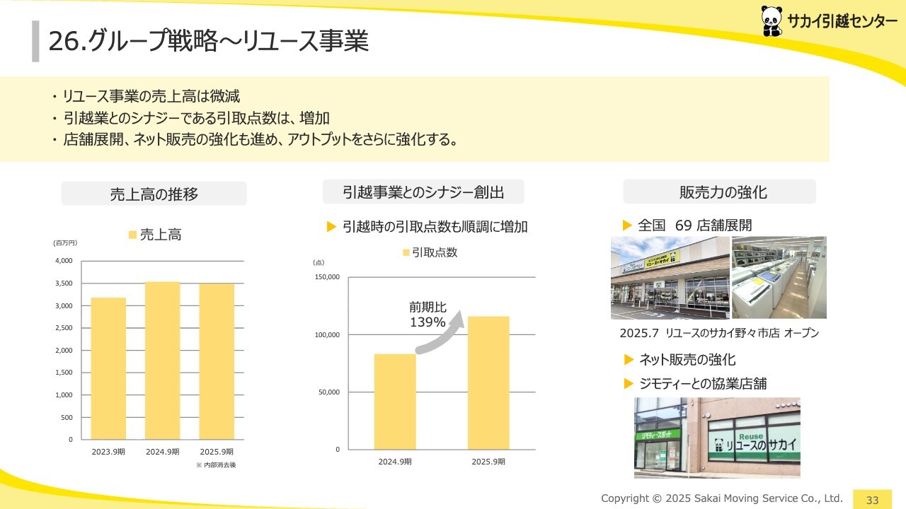 リユース事業の売上高は微減となりましたが、ほぼ横ばいの状況です。引越業とのシナジー構築では、引越時の引取点数が139パーセントと把握しています。特に引越時には不要品の引取需要が高いものの、販売面での強化が必要と考えています。
