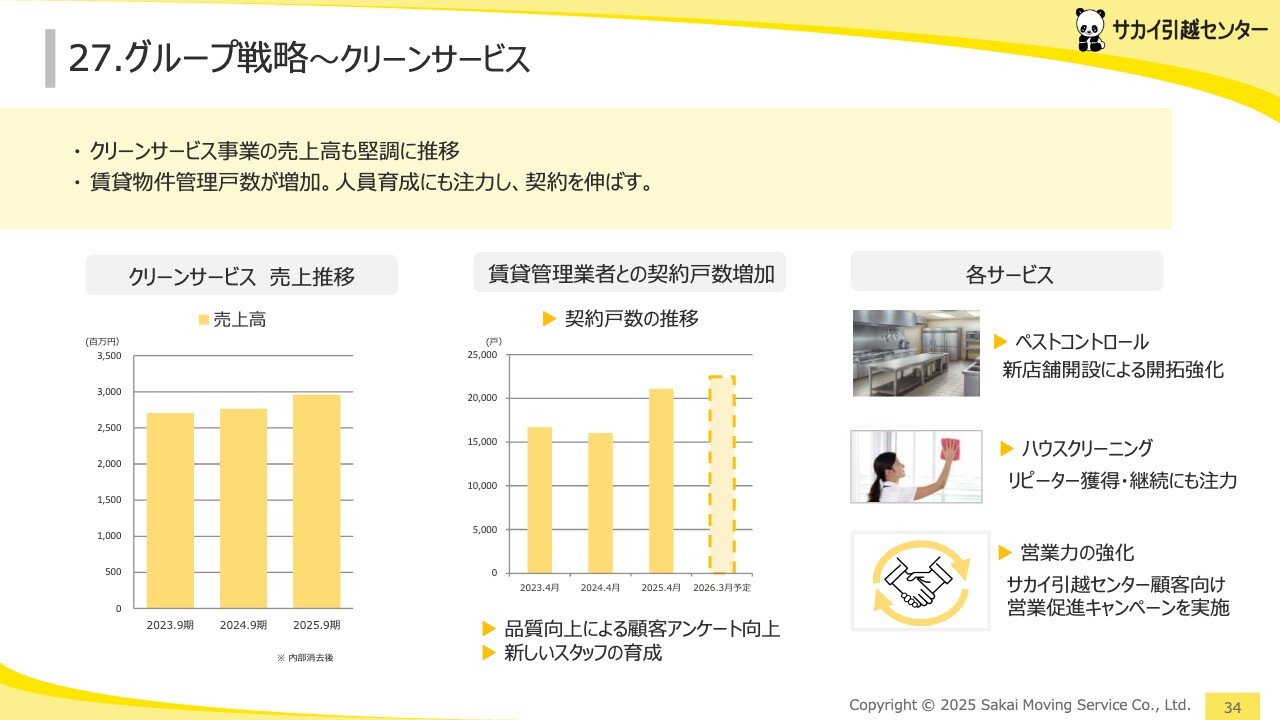クリーンサービスの売上は順調に推移しています。また、賃貸管理業者の契約数も増加傾向にあります。