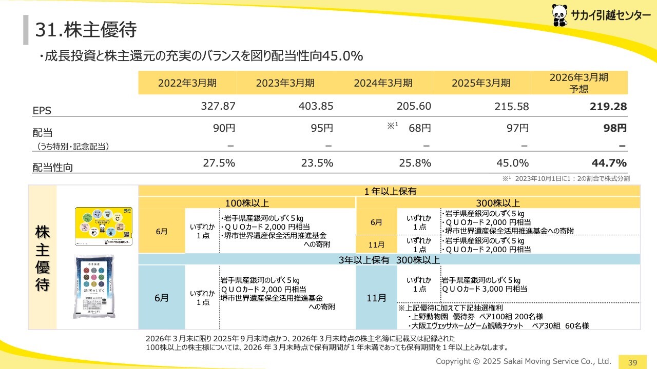株主優待としては、お米の優待は大変好評で、今期も継続したいと考えています。株主さまは我々の最大のファンであるとして、株主還元を重要視しつつ、成長戦略のバランスを保ちながら、今後も事業の拡大に取り組んでいきます。