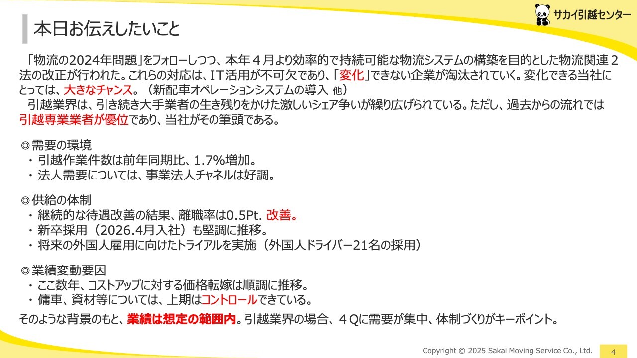 特に引越業界では第4四半期に需要が集中するため、第4四半期を見据えて第3四半期から準備を進めています。このように毎年お伝えしていますが、繁忙期に確実に対応できる体制が重要だと考えています。