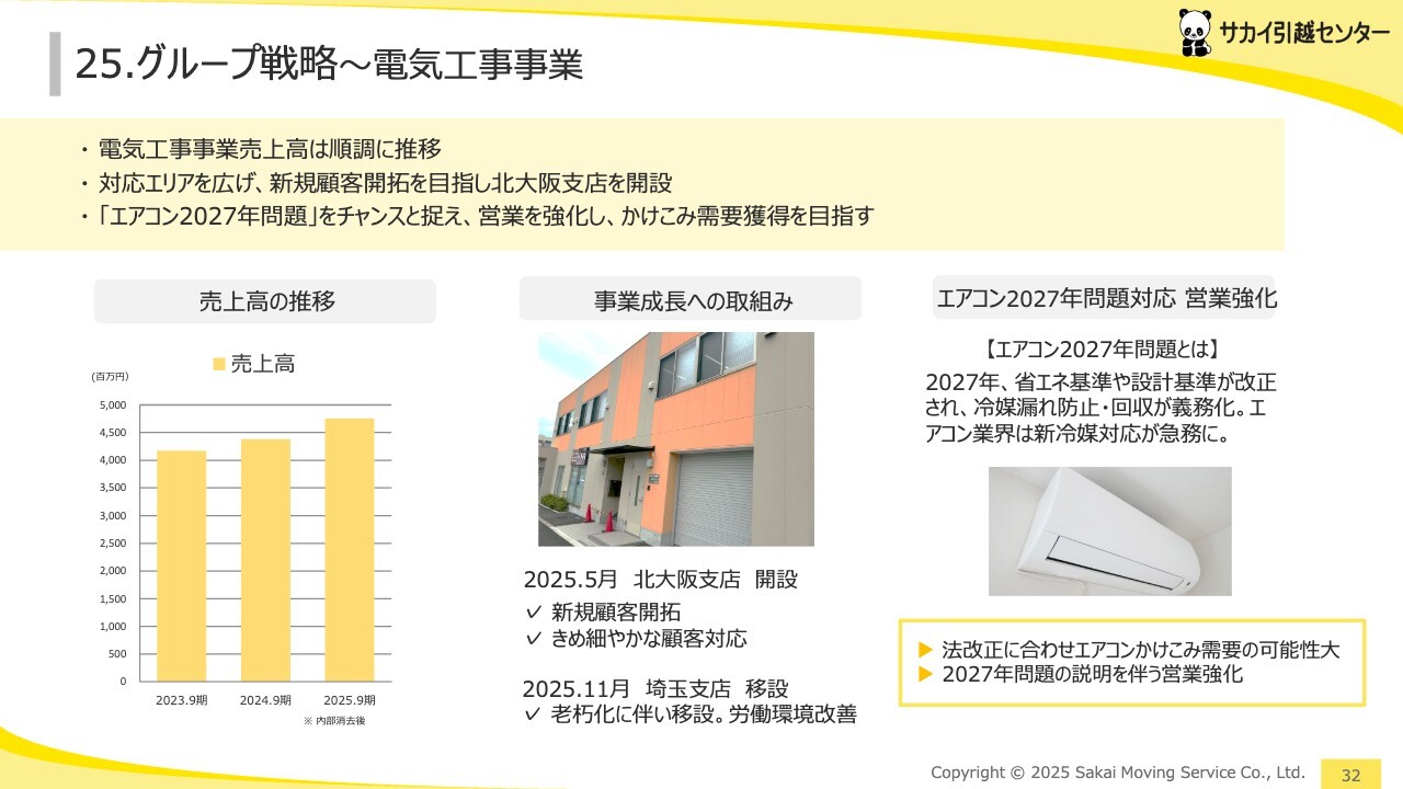 また、電気工事事業については、引越事業とのシナジーを引き続き継続しています。現在、電気工事業については引越以外の分野でもオーダーを受け付けています。例えば、防災関連やEV関連の施工、さらには引越以外の電気工事にも取り組んでいます。