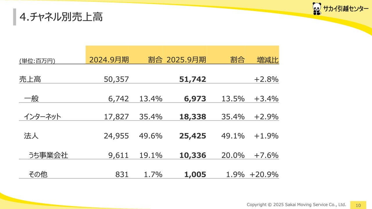 チャネル別売上高です。一般は前期比3.4パーセント増の69億7,300万円、インターネットは前期比2.9パーセント増の183億3,800万円、法人は前期比1.9パーセント増の254億2,500万円、法人のうち事業会社は前期比7.6パーセント増の103億3,600万円、その他は前期比20.9パーセント増の10億500万円となっています。