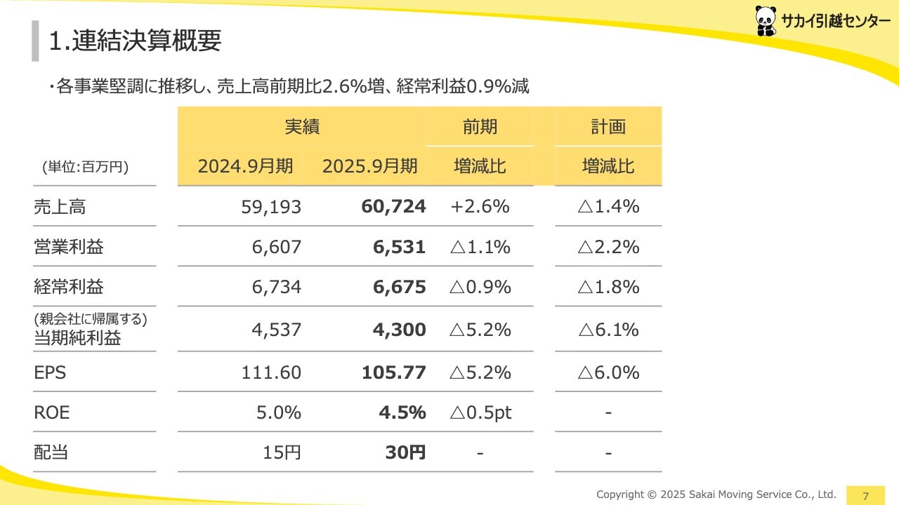 下田敬司氏:決算概要について、経理本部の下田から報告します。はじめに連結決算の概要です。2025年9月期の売上高は、前期比2.6パーセント増の607億2,400万円、営業利益は前期比1.1パーセント減の65億3,100万円、経常利益は前期比0.9パーセント減の66億7,500万円、親会社に帰属する当期純利益は前期比5.2パーセント減の43億円となりました。