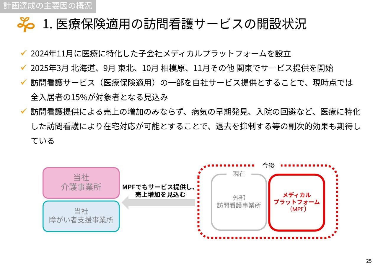 新規事業として取り組んでいるメディカル事業についてですが、先ほどKPIの項目でご説明した介護事業や障がい者支援事業において、単価の上昇を促す取り組みとなっています。この事業は各地域で順調に開設が進んでいます。