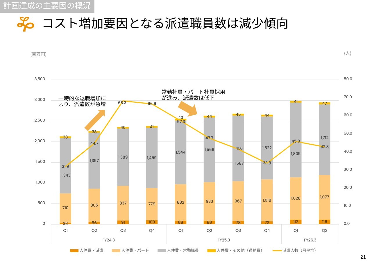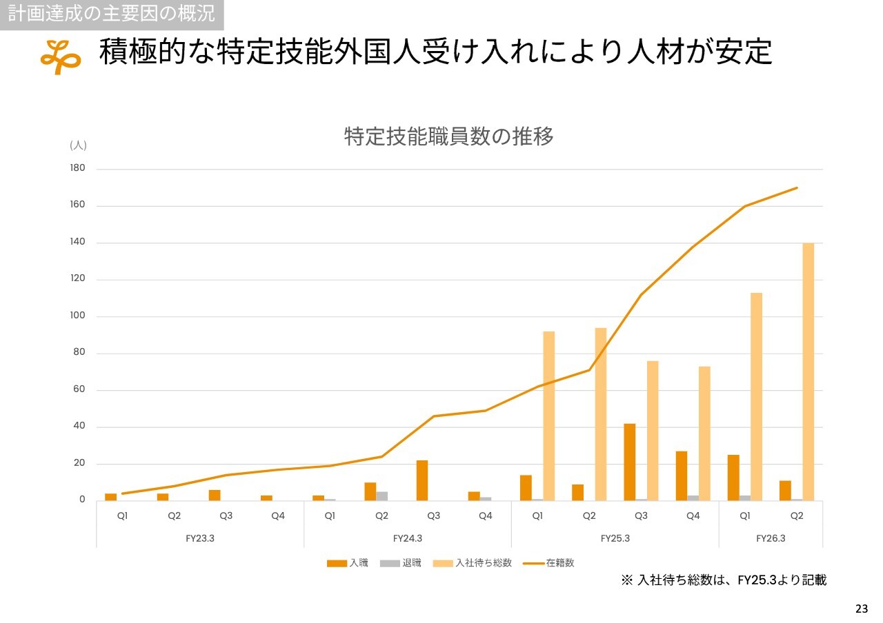 特定技能外国人の受け入れは非常に重要な要素だと考えています。例年、第1四半期および第2四半期では、入管の手続きも含めて滞ることがありますが、第3四半期および第4四半期では、昨年度を含め順調に入職が進んでいます。このため、新規にオープンした事業所や、既存の派遣職員からの切り替えも順調に進むと期待しています。
