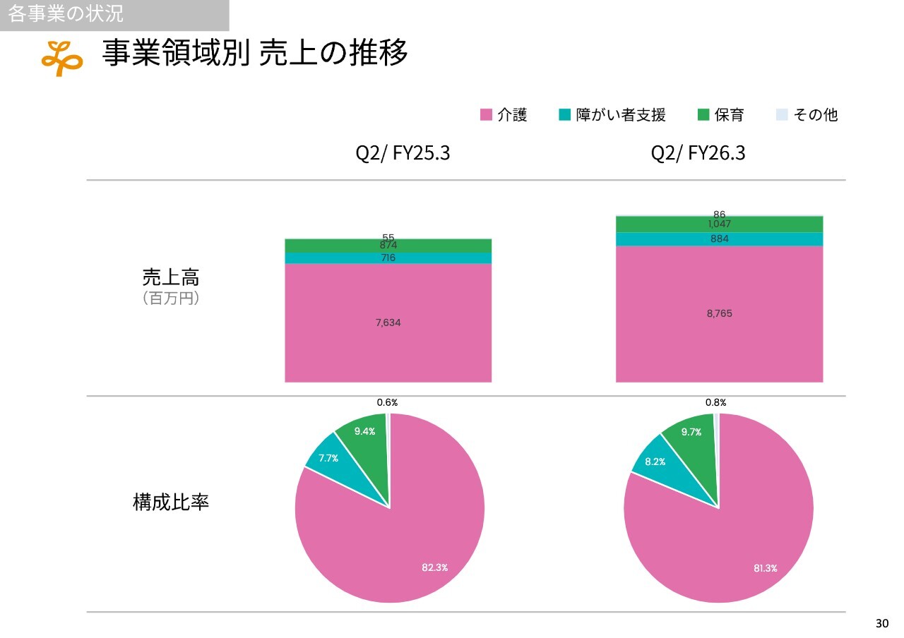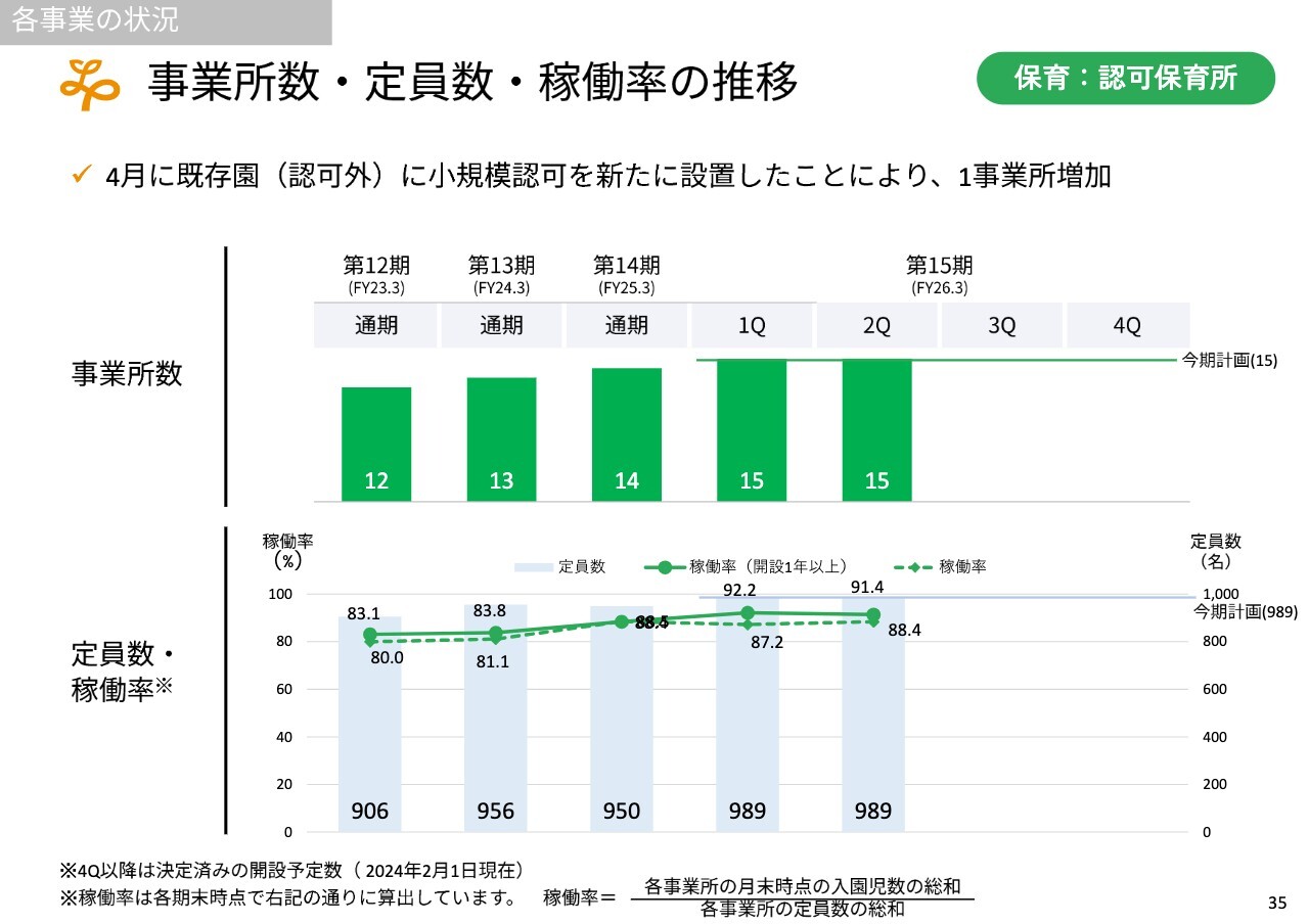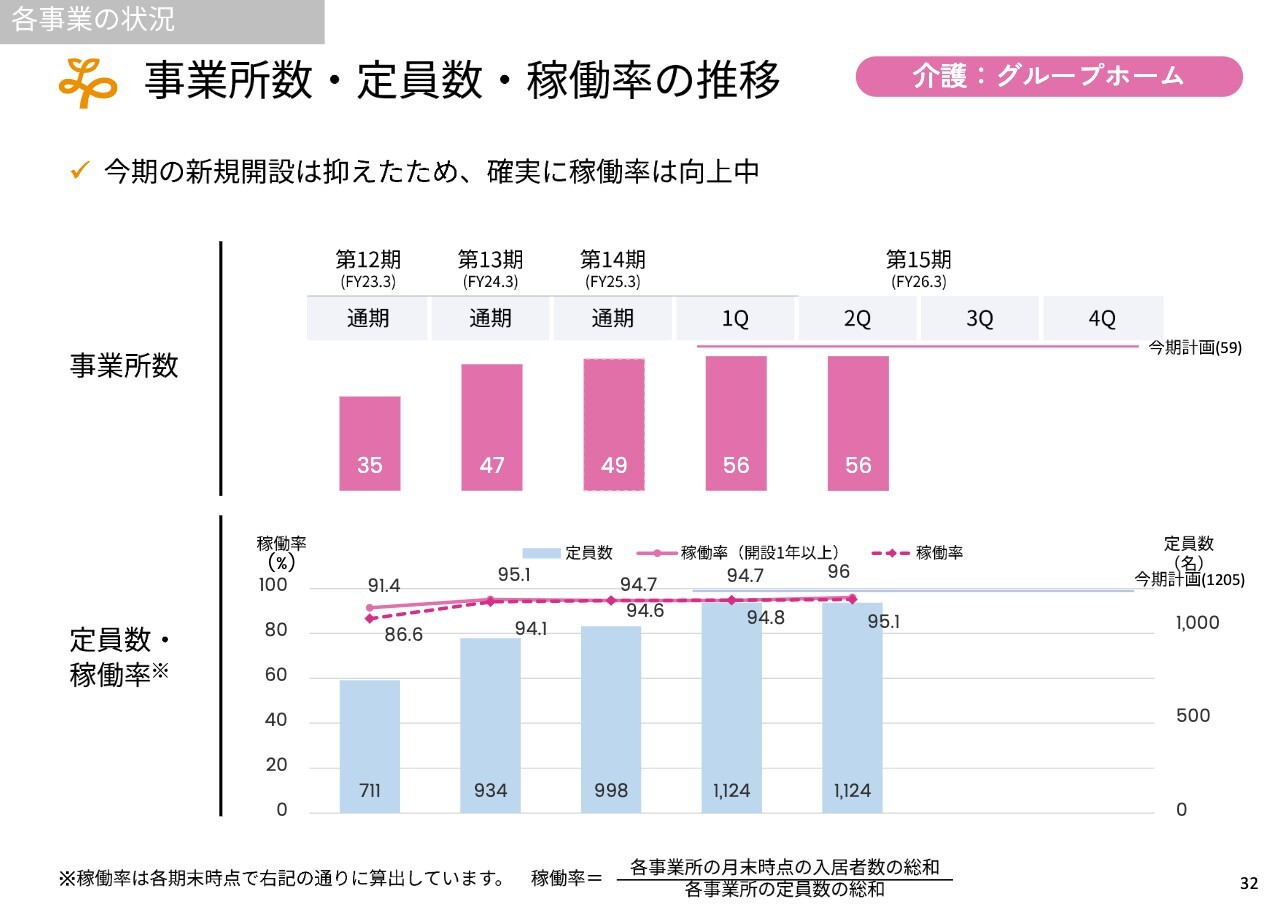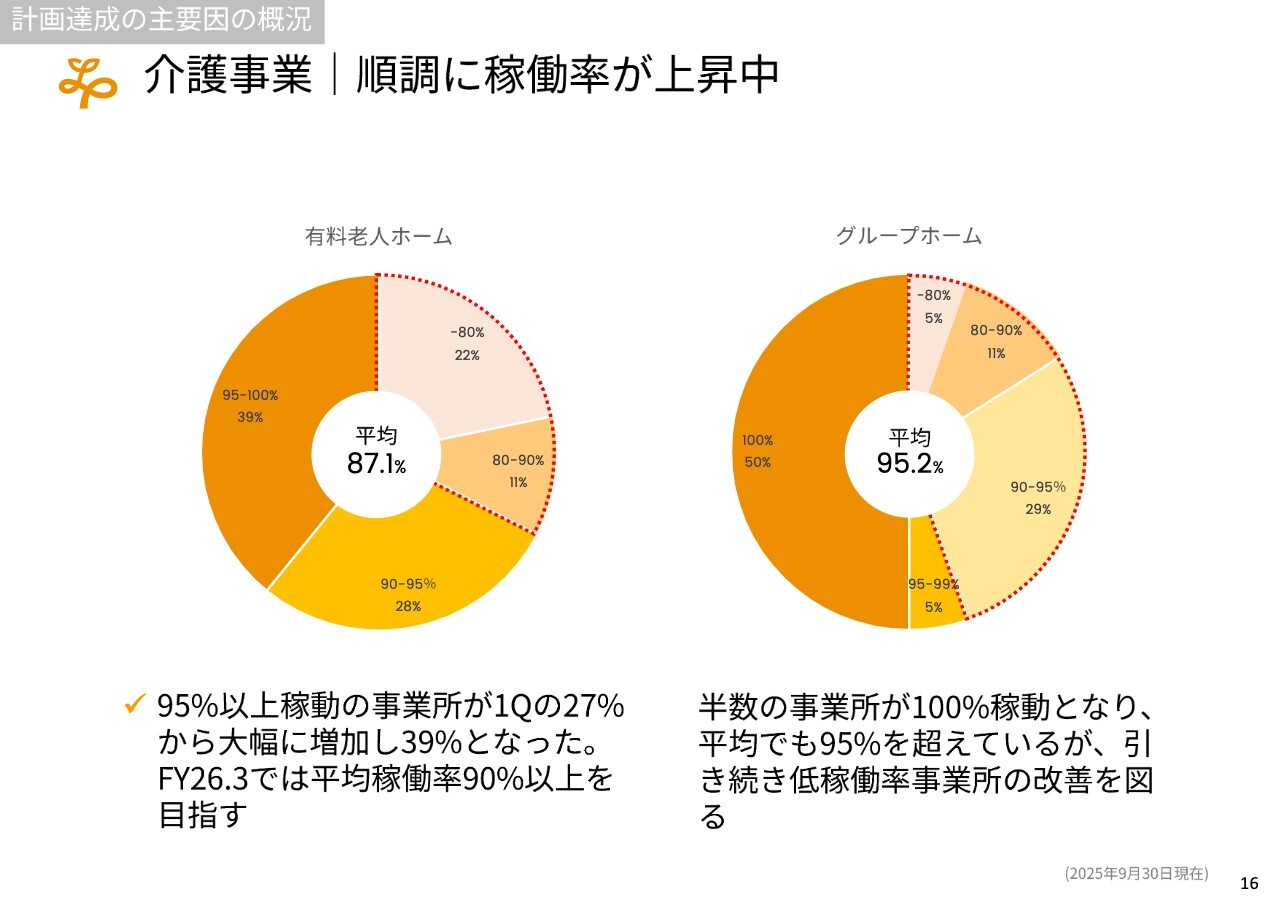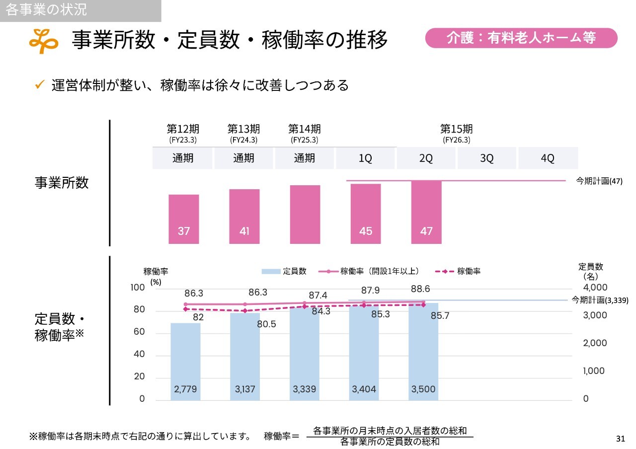 稼働率を上げて単価を向上させ、新規事業所を立ち上げるという観点では、まず介護の有料老人ホーム事業がすでに今期の計画を達成し、稼働率も順調に上昇している状況です。