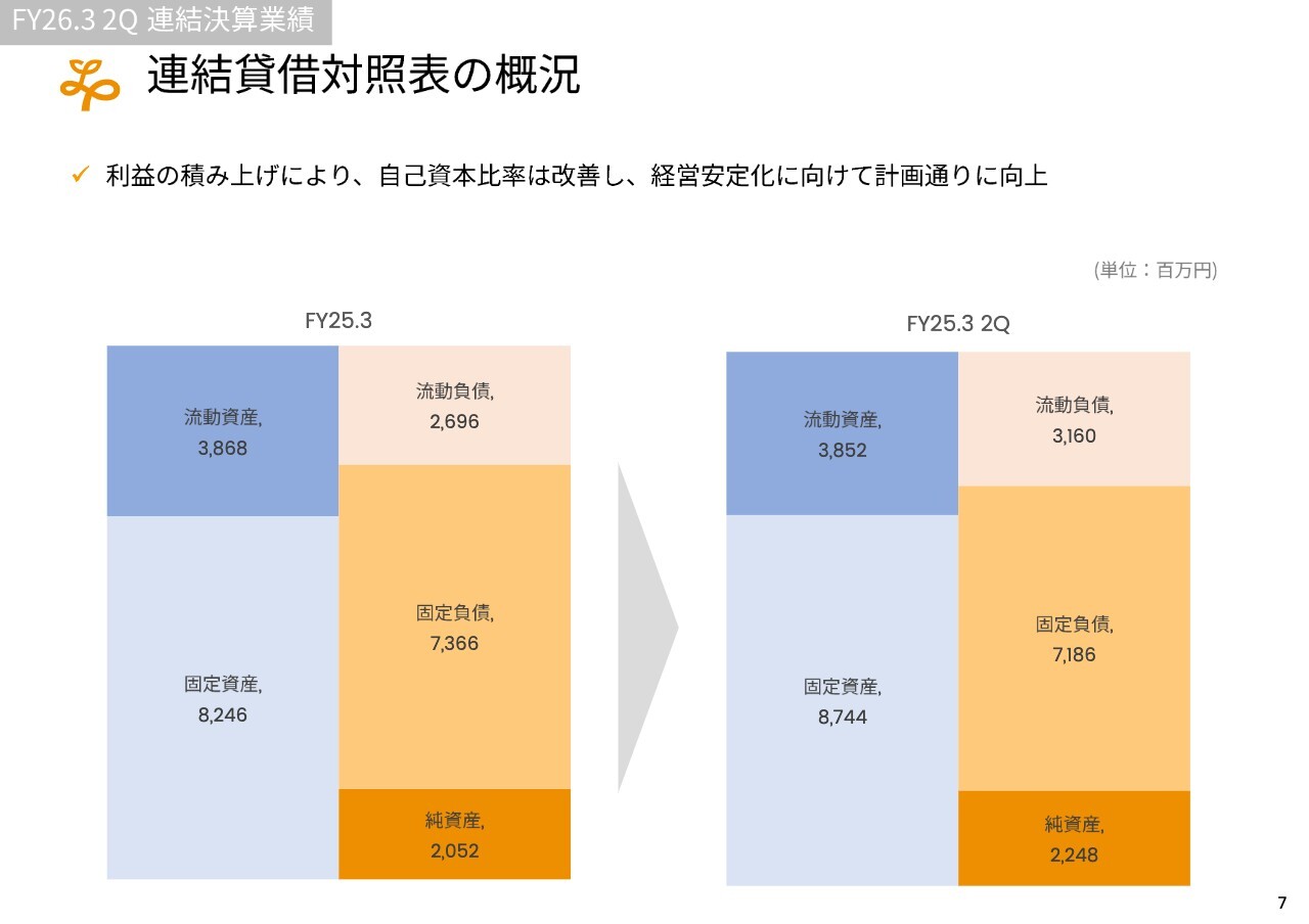 バランスシートについては、スライドの概要のとおり、いろいろな投資を進めつつも返済が進んでおり、健全性を保っていると考えています。ただし、昨今の金利上昇を踏まえ、今後さらに財務体質を改善していきたいと考えています。