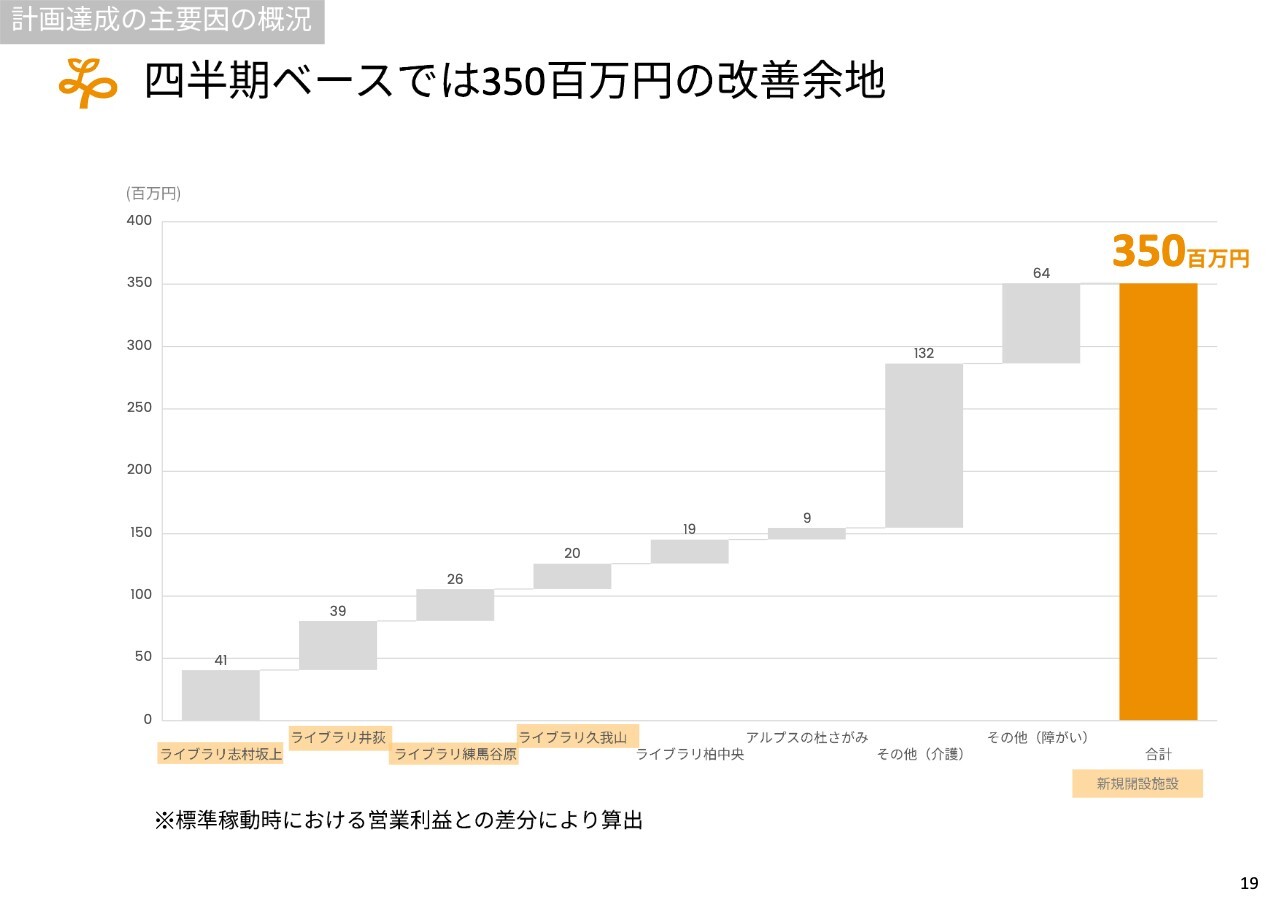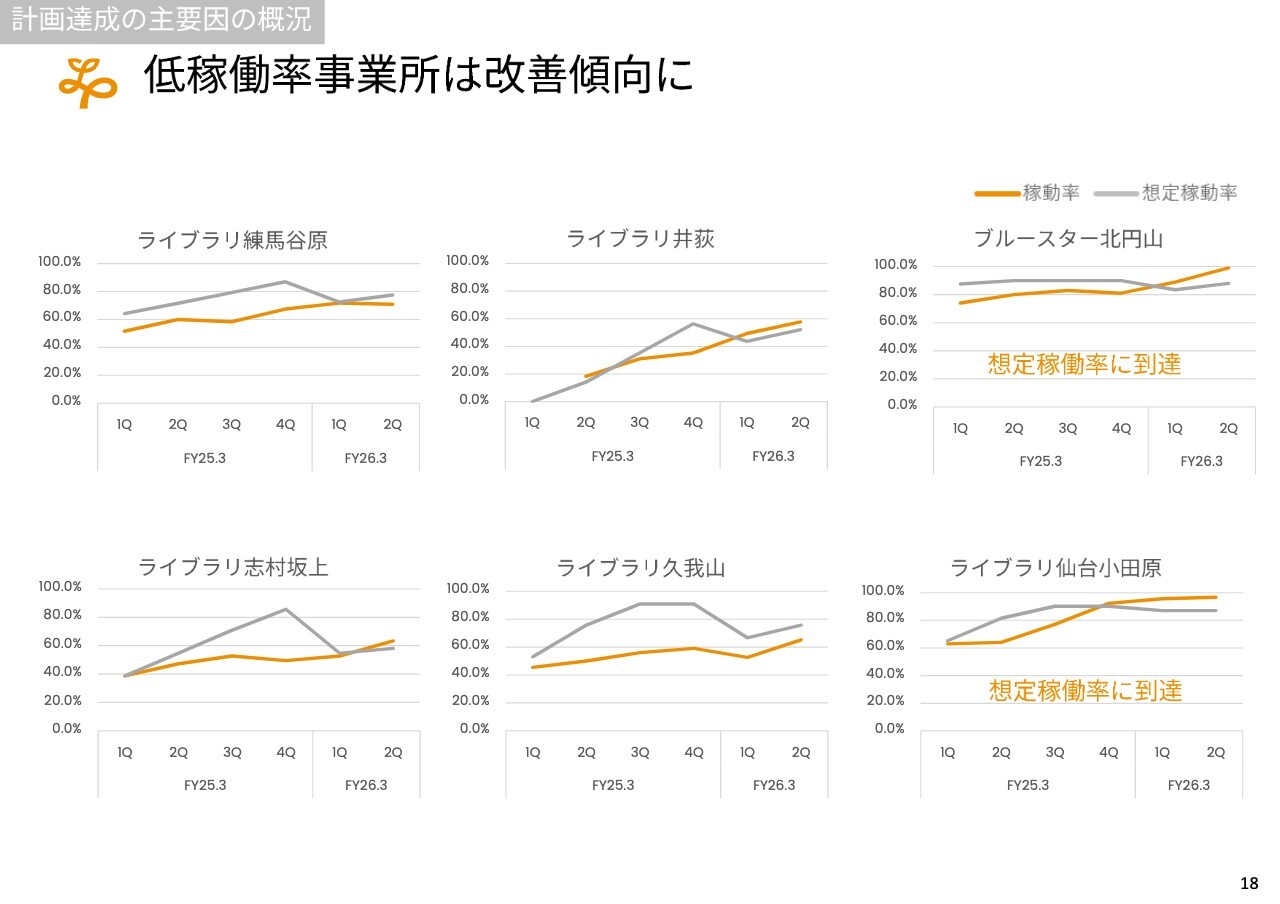 特にこの数事業だけでも、年間で億単位の改善になると考えています。昨年度末に論点となっていた6事業所のうち2事業所については安定稼働に移行し、ほぼ100パーセントの稼働率に到達しました。