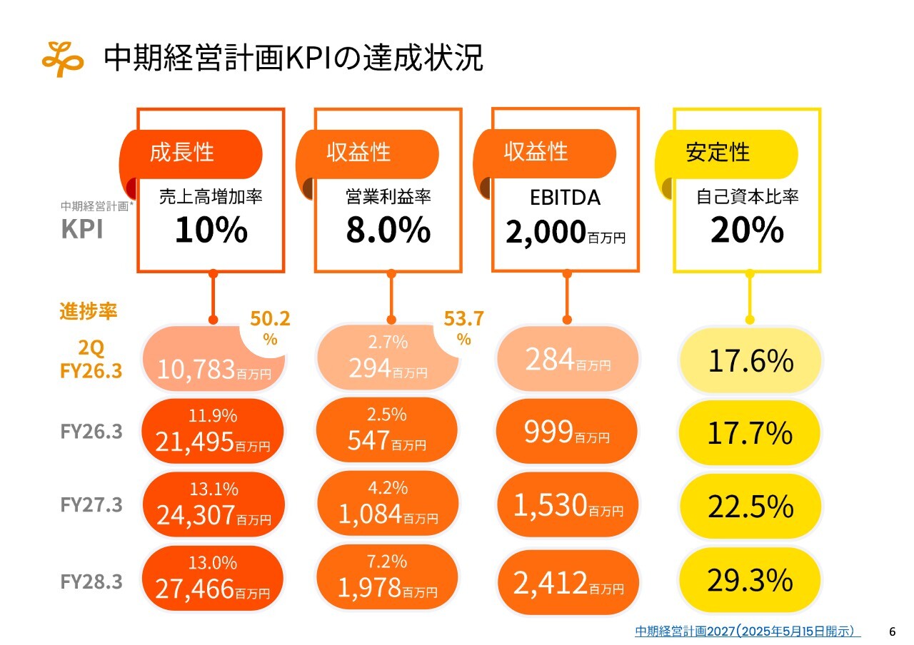 中期経営計画ではすでに発表していますが、当社の目指すKPIとして、成長性を示す売上高増加率、収益性を示す営業利益率、キャッシュフローを示すEBITDA、そして安定性を示す自己資本比率を掲げています。2026年3月期第2四半期は3ヶ年計画の第1期目にあたり、半期においては順調に推移しています。