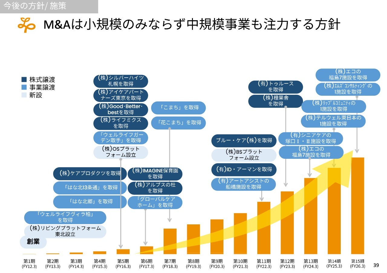 今後は、小規模だけでなく中規模のM&Aも推進し、それによって売上および利益の大幅な成長につなげたいと考えています。